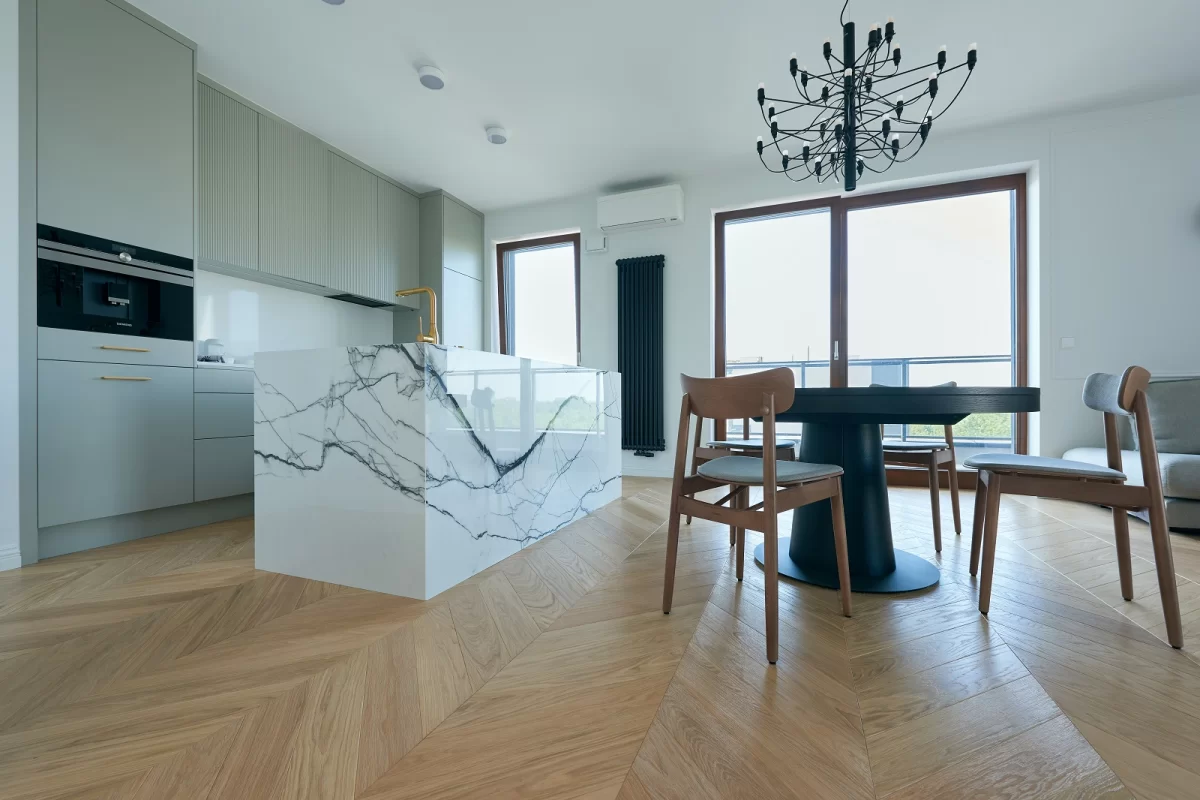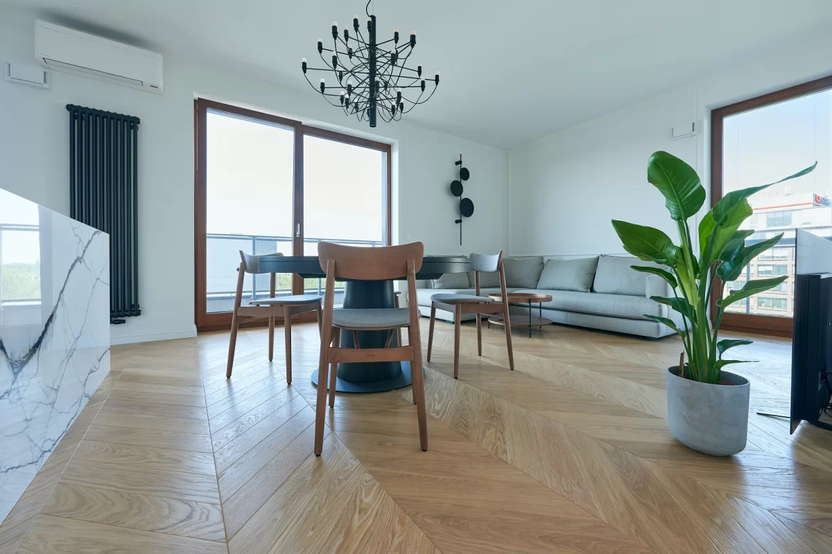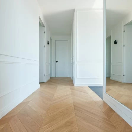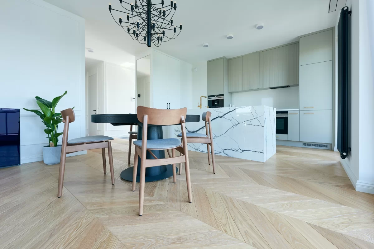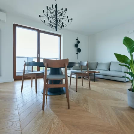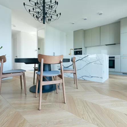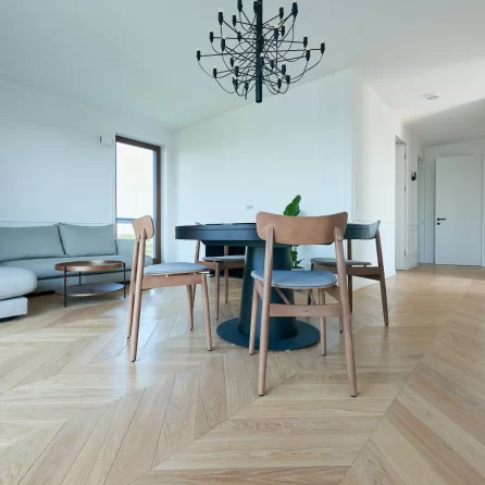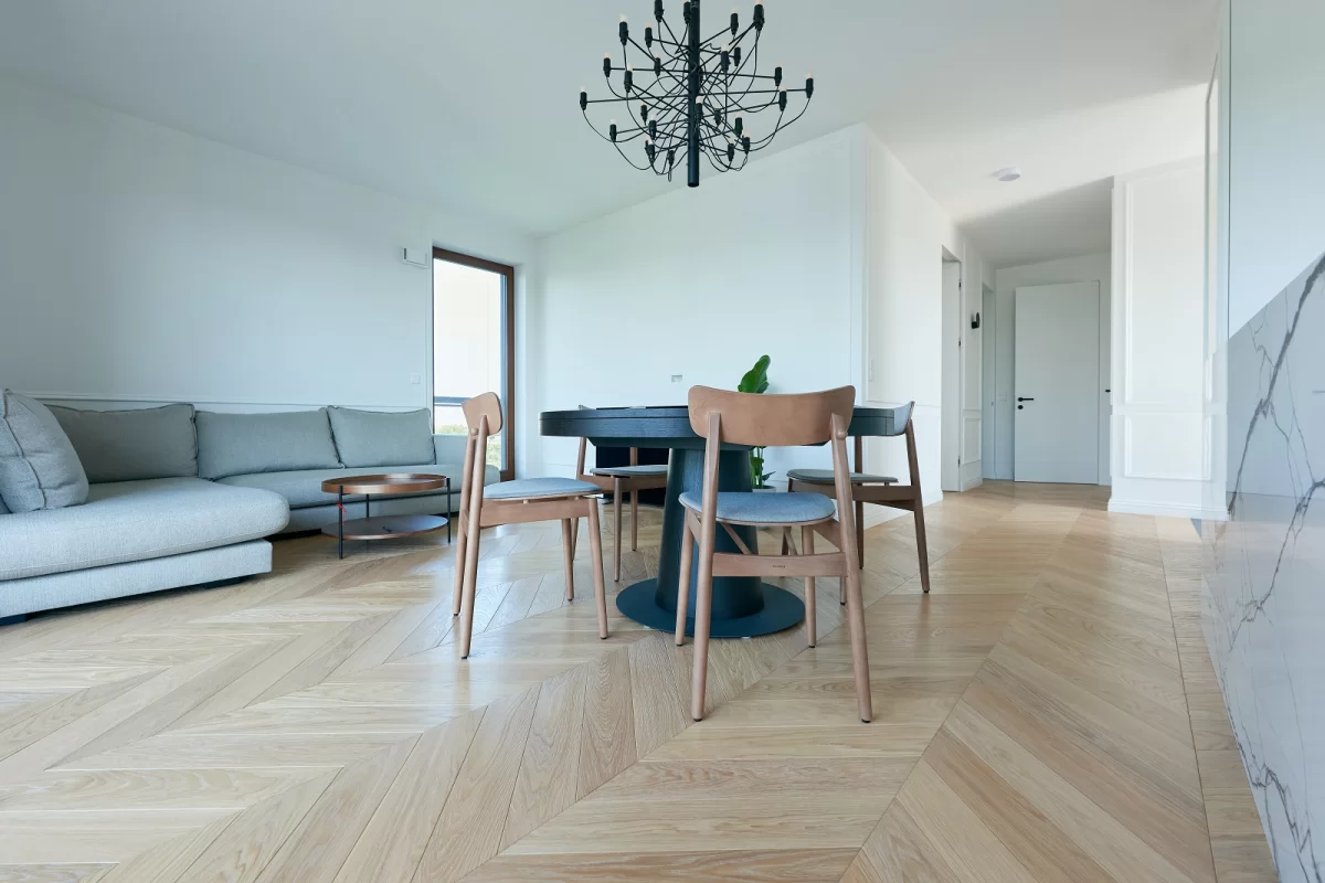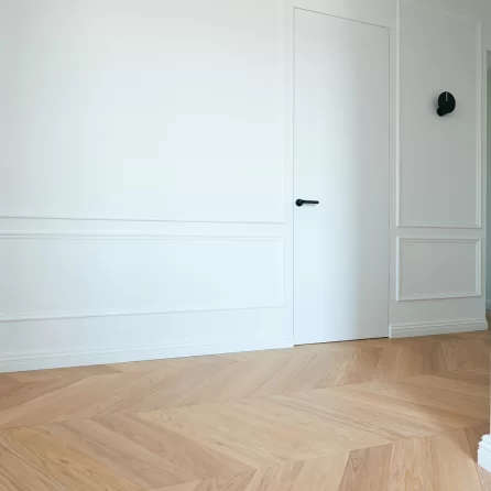Oiled floors are most commonly used on surfaces that will be heavily used, e.g. dance halls. The oiled surface is matte. Oiled floors require more frequent periodic maintenance depending on the intensity of use. It should be noted that wood on oiled floors is more fully protected, as the oil penetrates through the wood, preserving and impregnating its surface from several to several millimeters deep. Oiled and waxed floors can be renewed only in one dirty or damaged area without the need for a general renovation. By using oils, we preserve the natural structure of the wood, including in touch, as it can be felt by running a hand over the floor surface.