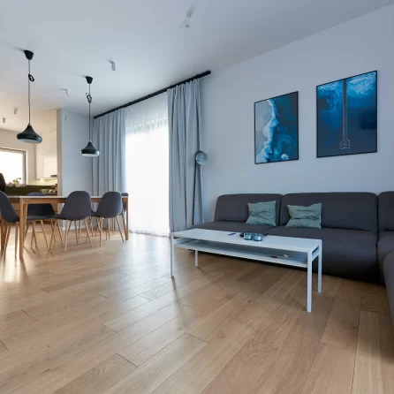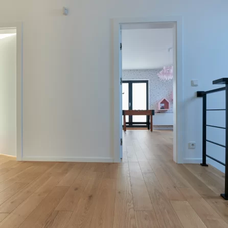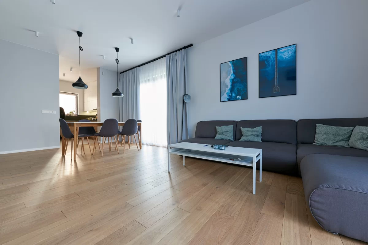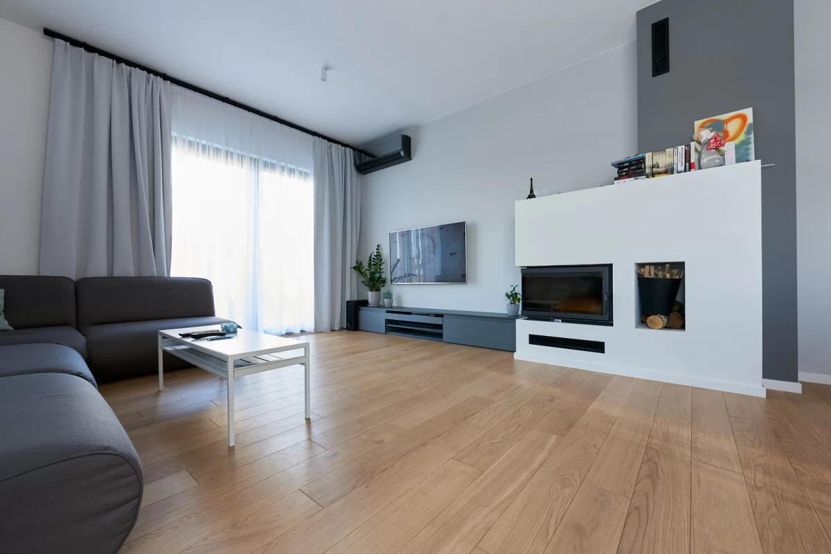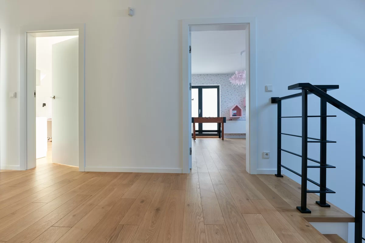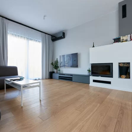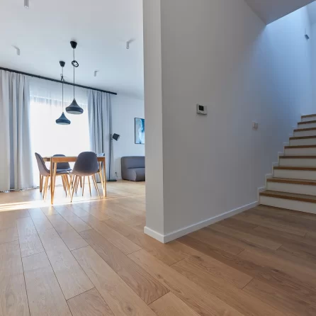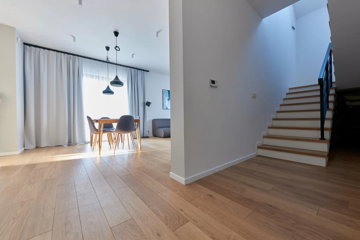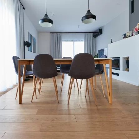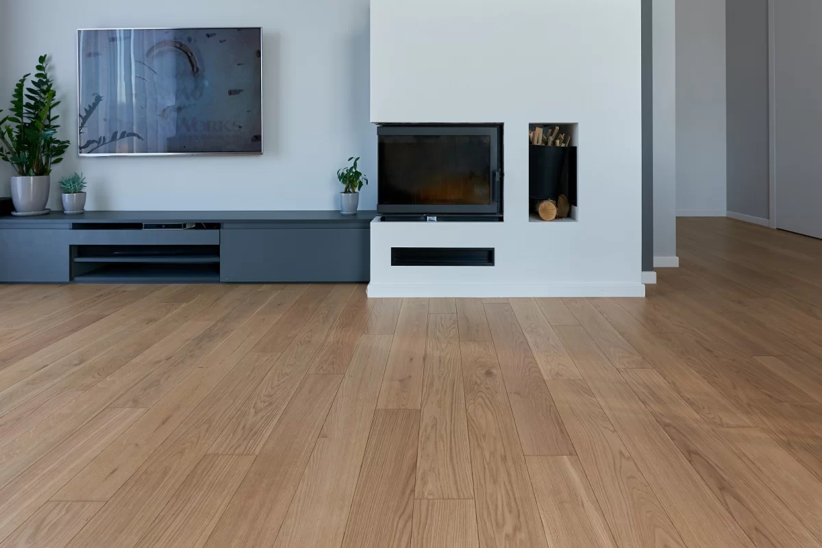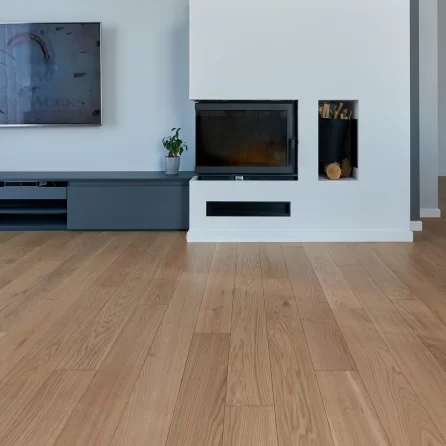 Oak oil-waxed board with a warm color and visible knots. Elegant and easy to maintain.