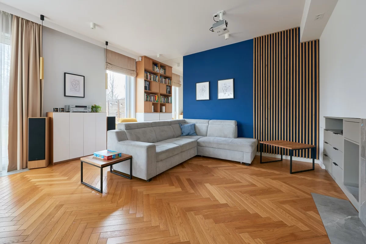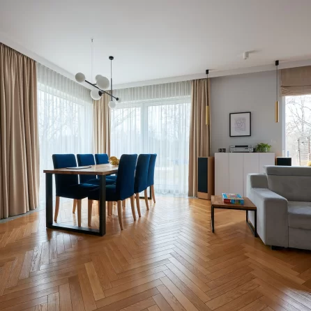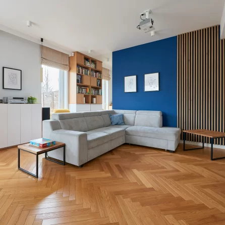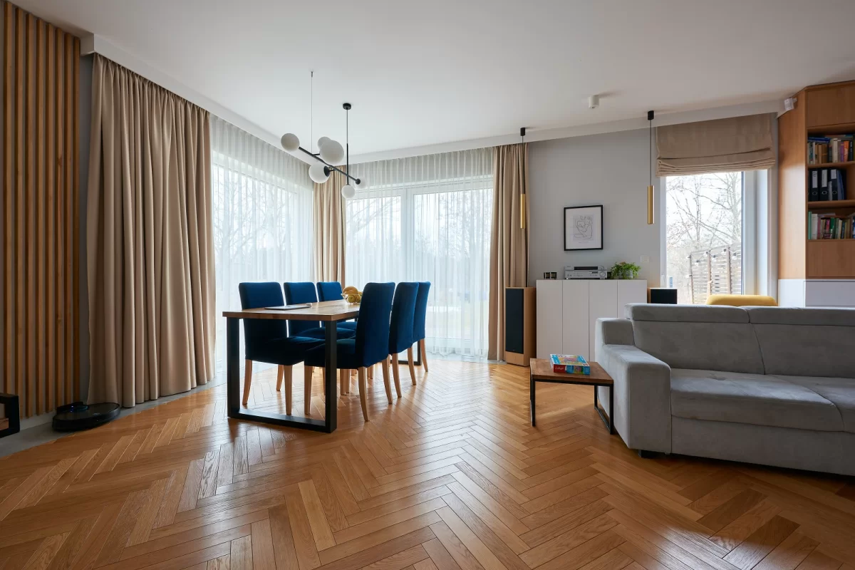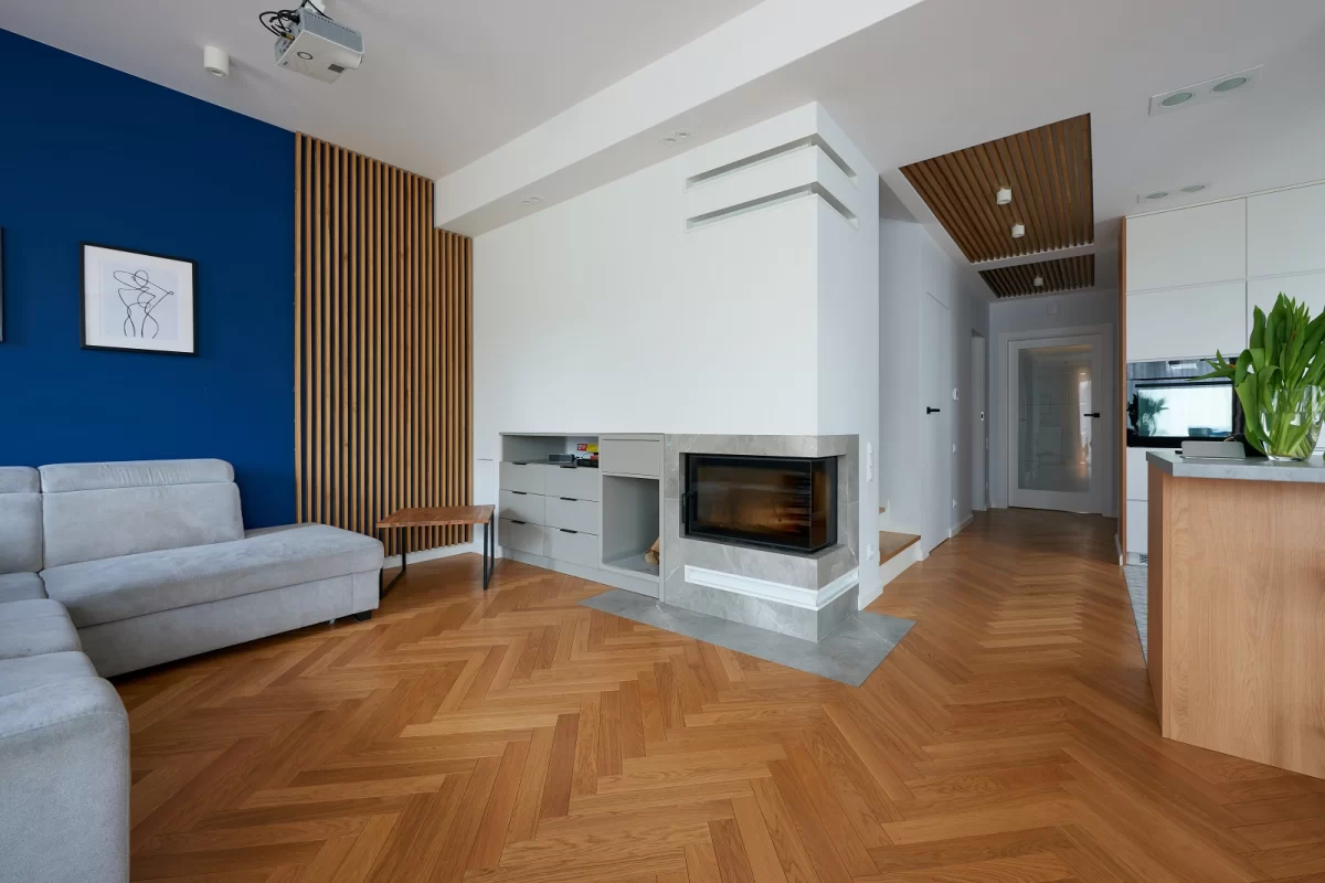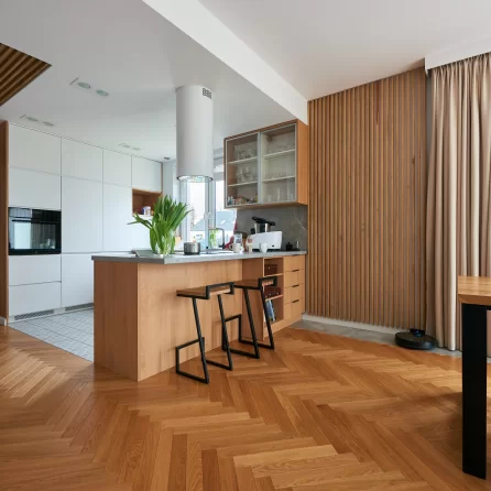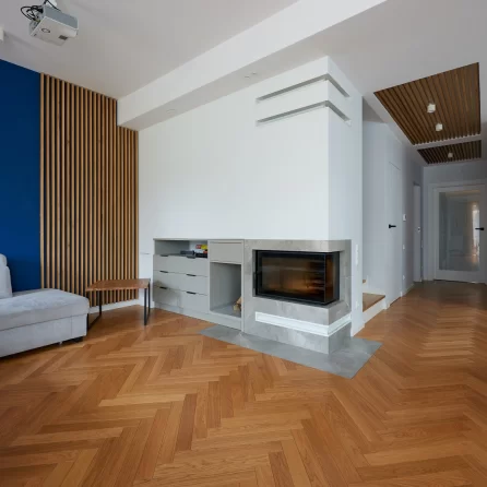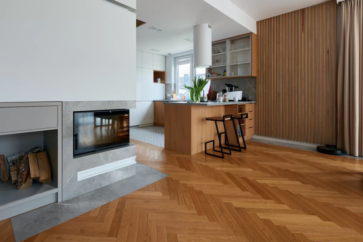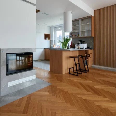 Lacquered oak engineered parquet with a warm color. Elegant and easy to maintain.