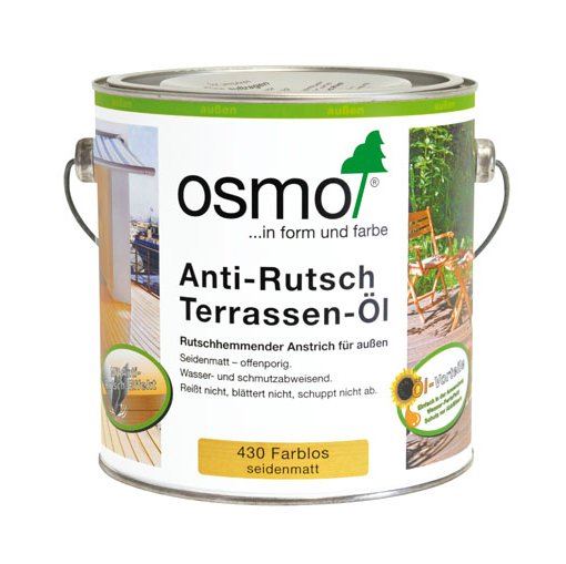 Olej Antypoślizgowy do Tarasów Osmo jest bezbarwny i dlatego też tylko w ograniczony sposób chroni przed słonecznymi promieniami UV. Przy bezbarwnej jedynej powłoce do powierzchni z narażeniem na silne warunki atmosferyczne oraz do powierzchni,