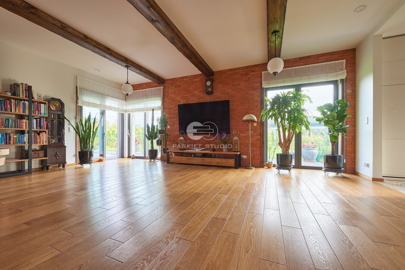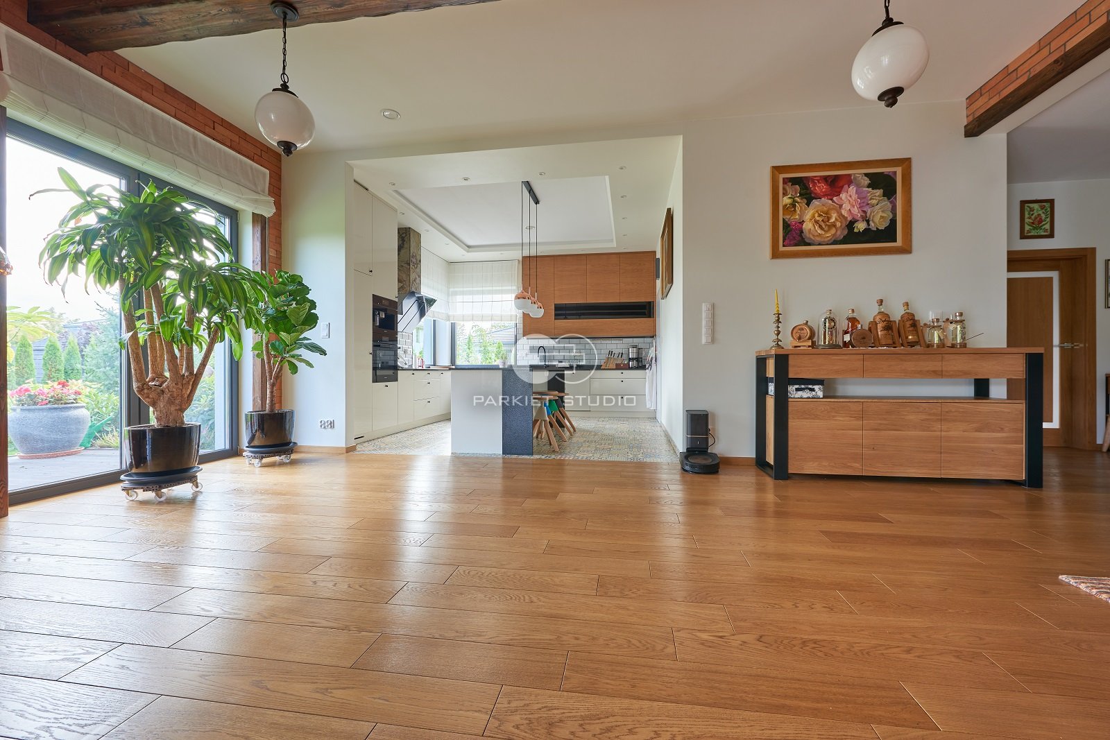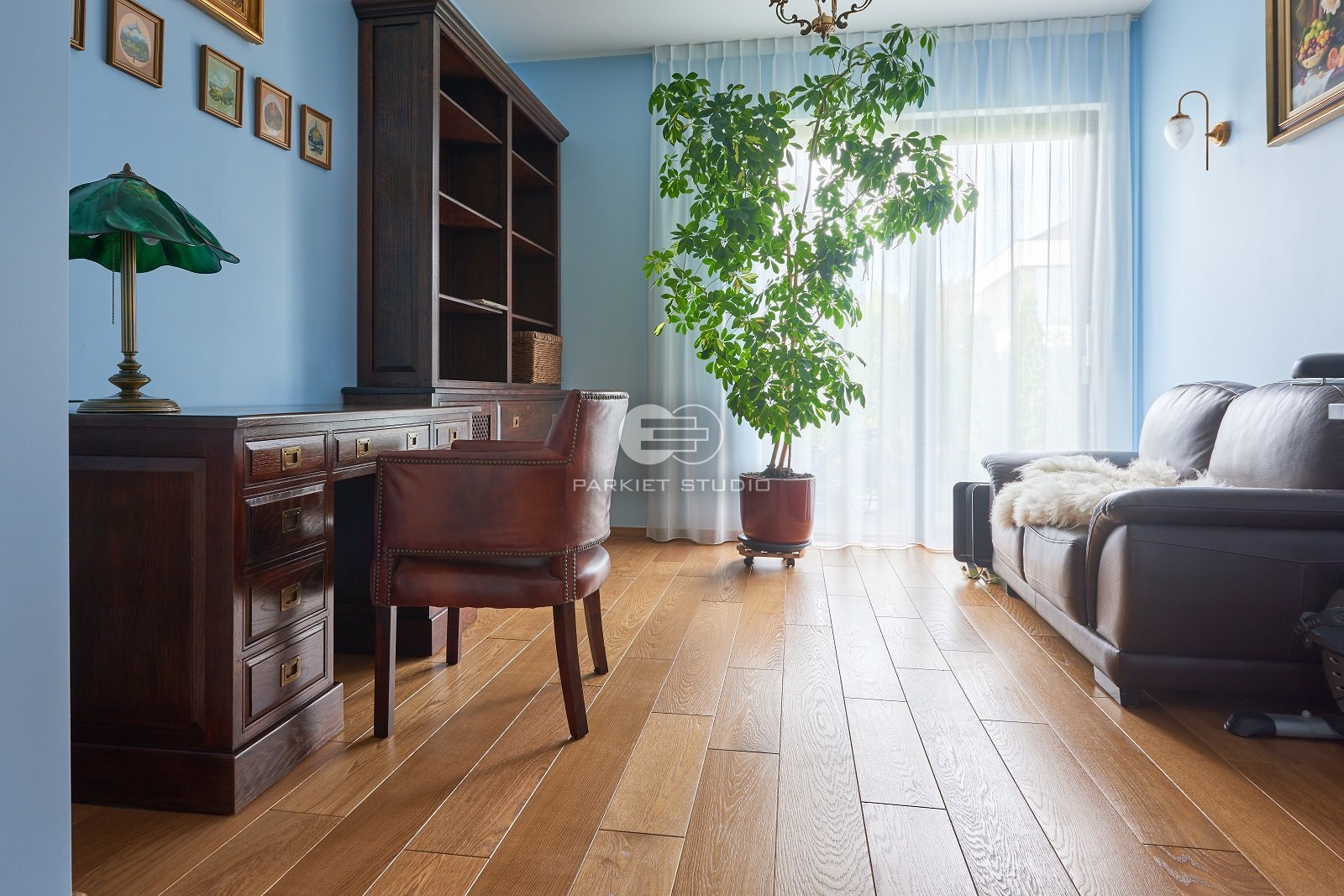 Deska dębowa polakierowana w tonacji bursztynowej, miodwej. Ciepły kolor tej podłogi przywołuje na myśl naturalne barwy związane z przyrodą. Daje poczucie spokoju, harmonii i równowagi.