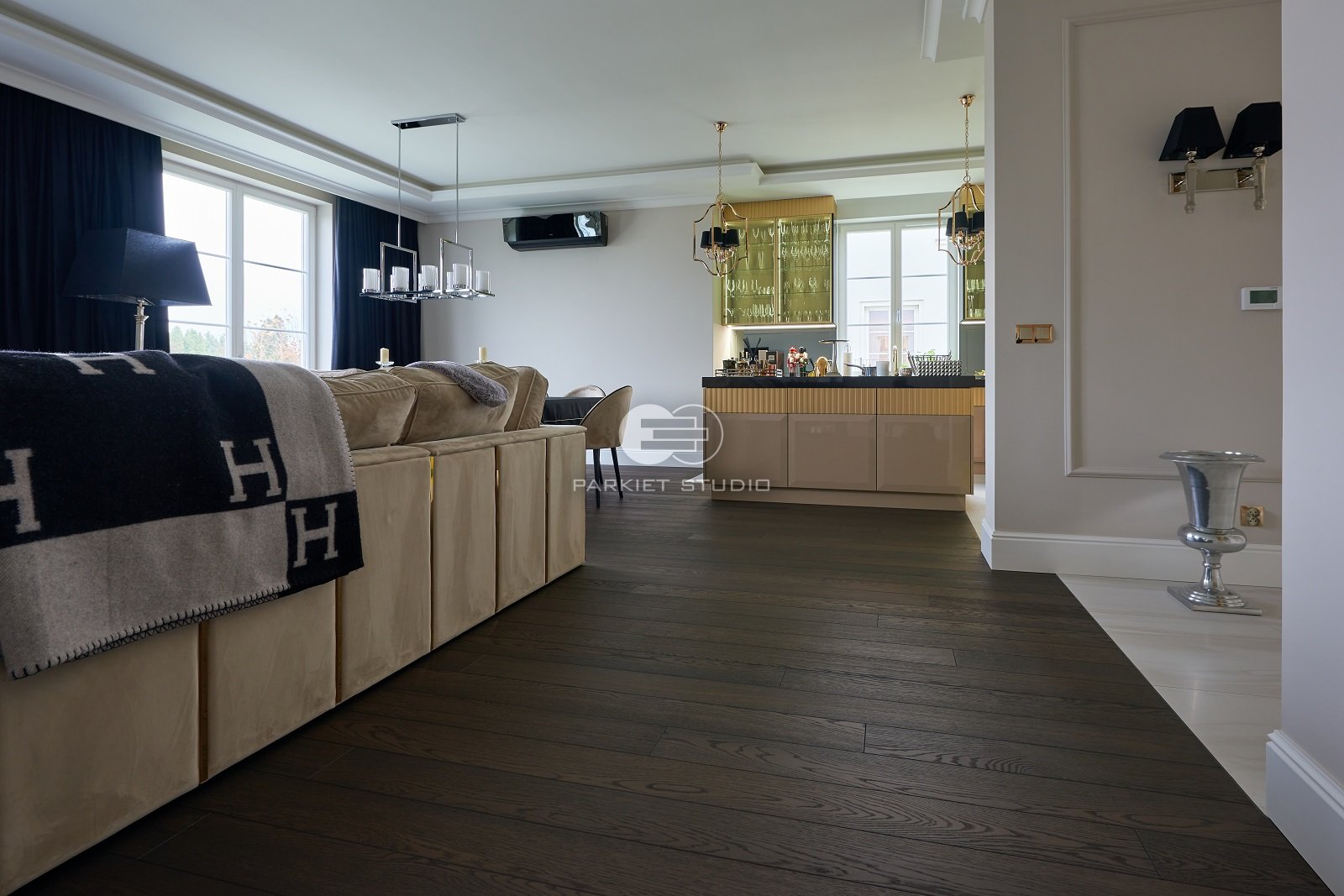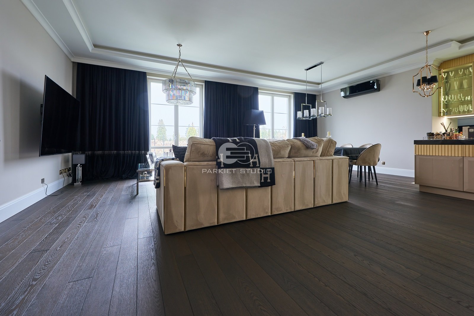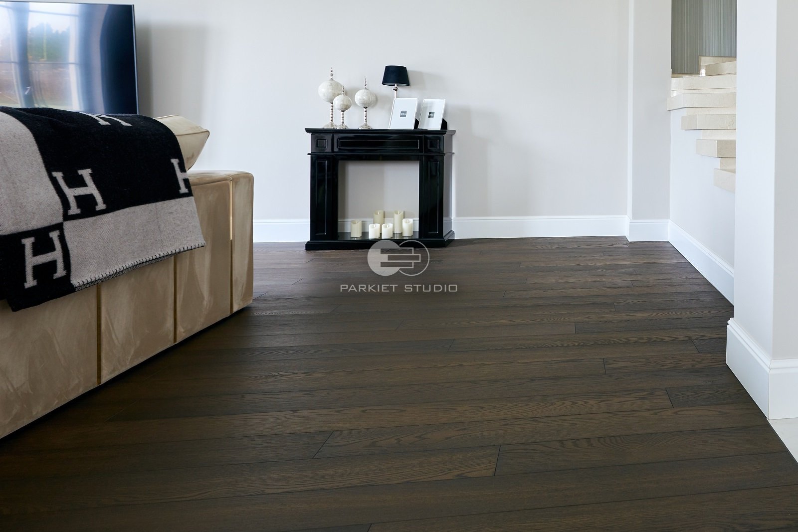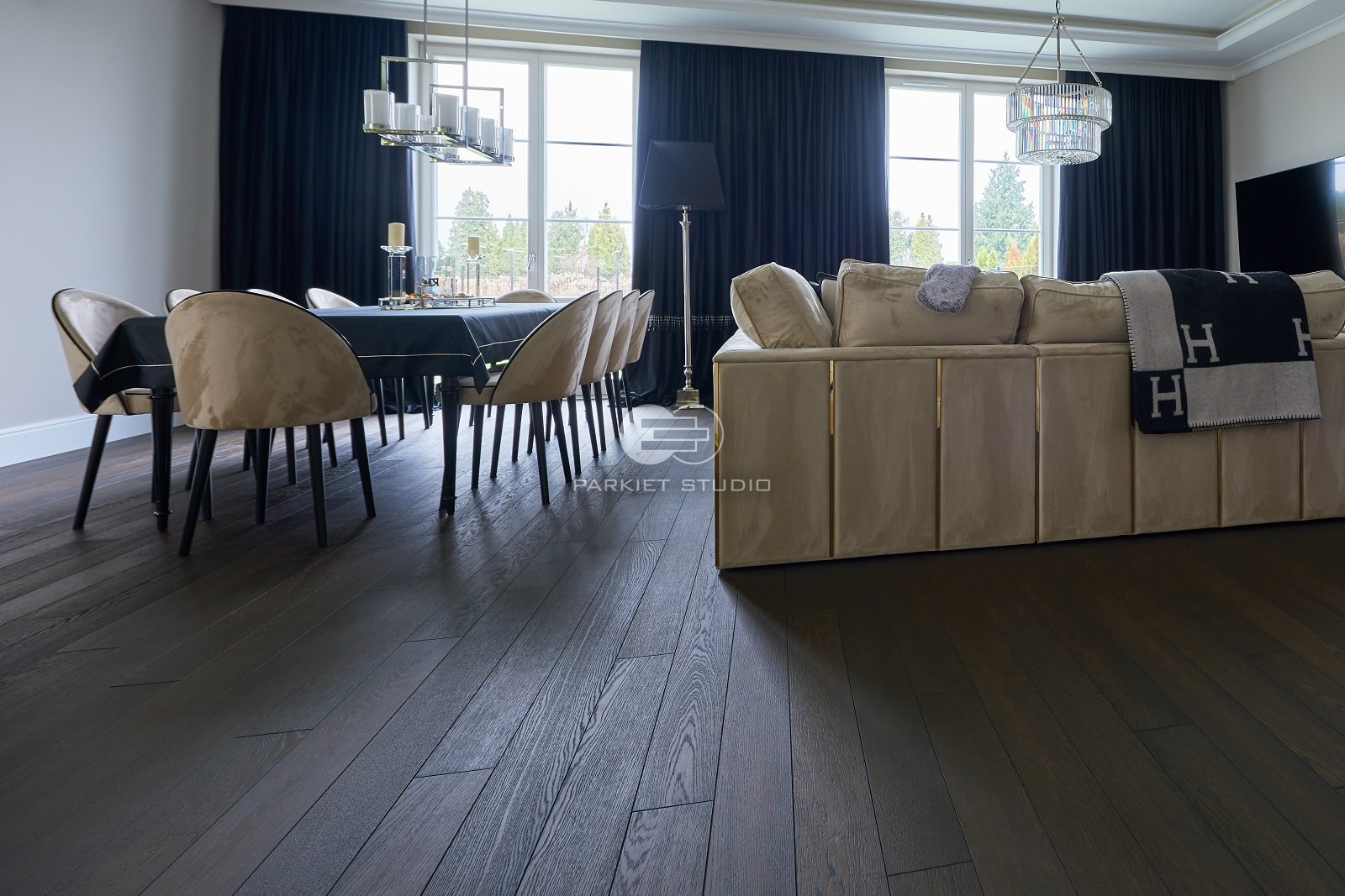 Podłoga dębowa olejowoskowana w mocnych odcieniach brązu i czerni. Spełni się w dużych dobrze oświetlonych wnętrzach.