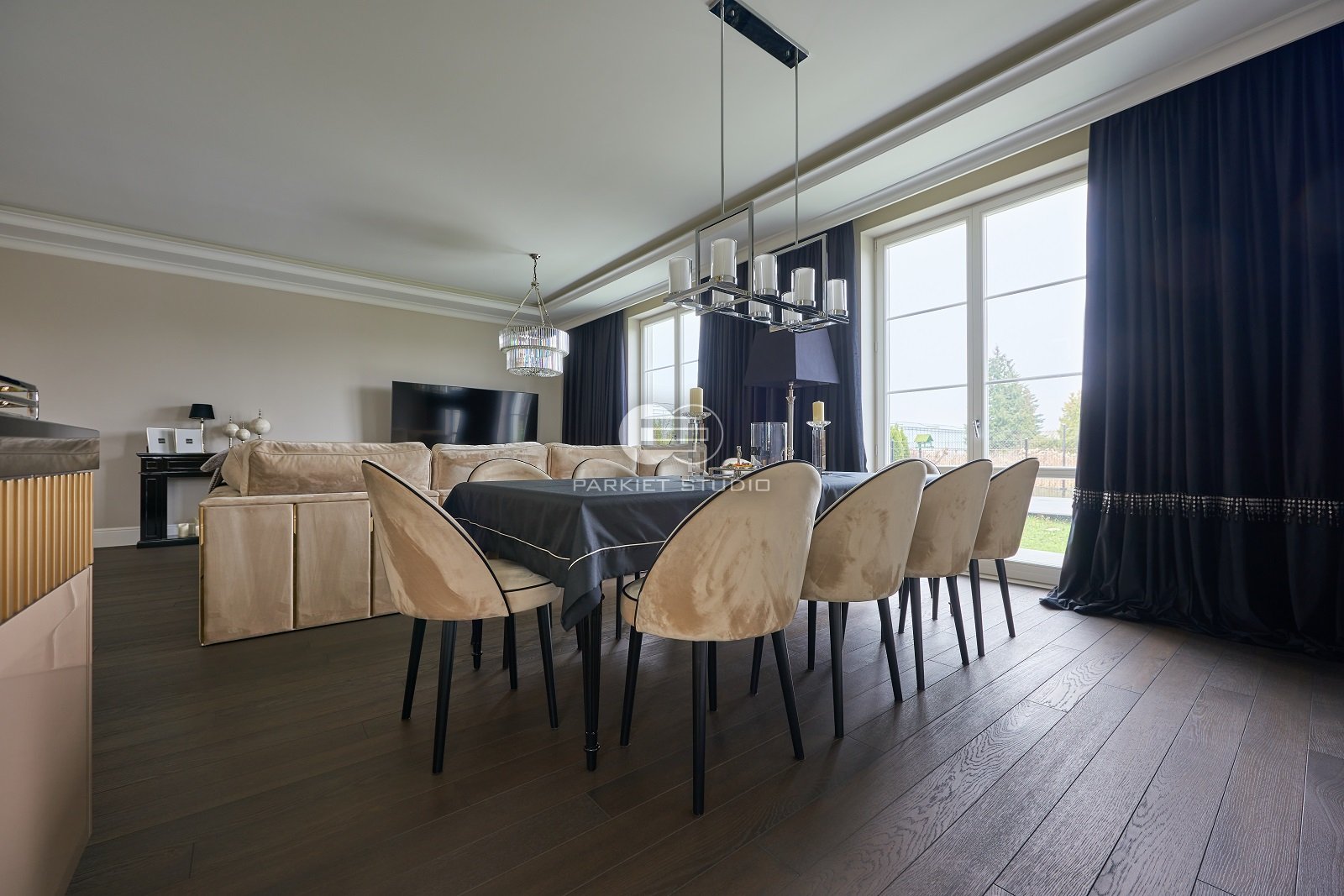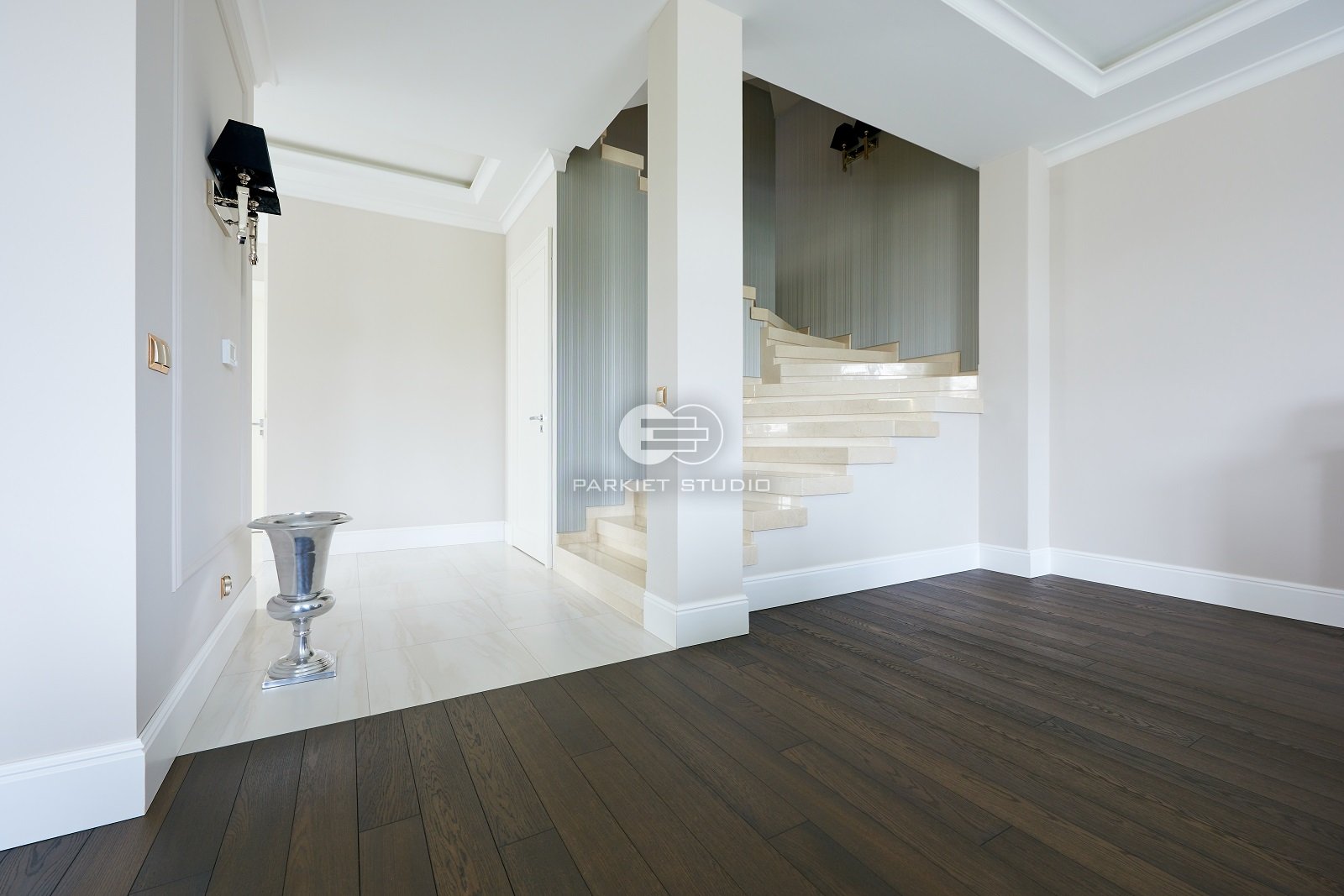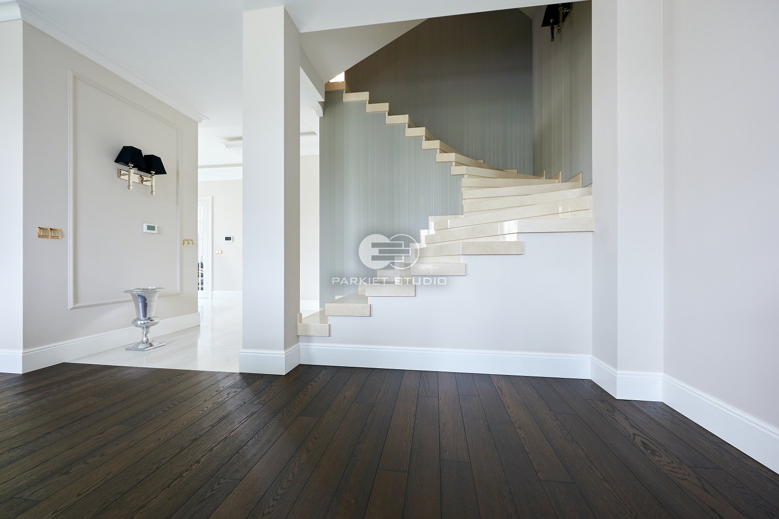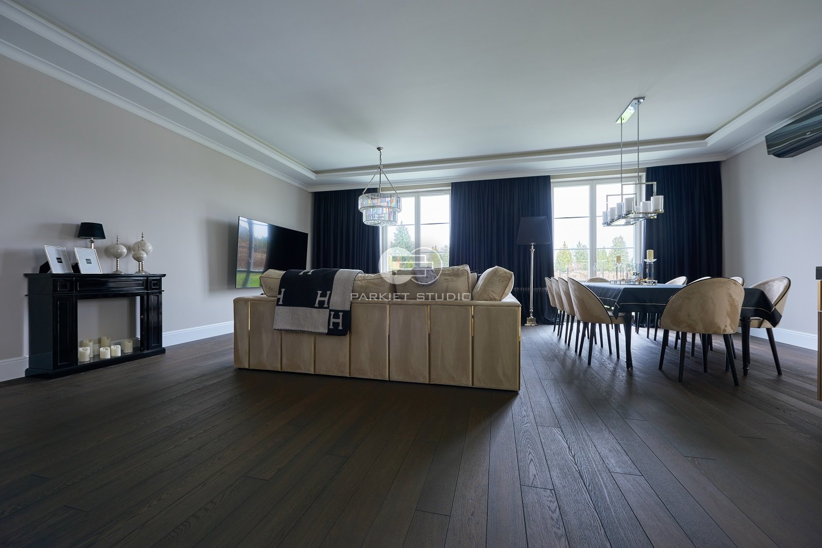 Podłoga dębowa olejowoskowana w mocnych odcieniach brązu i czerni. Spełni się w dużych dobrze oświetlonych wnętrzach.