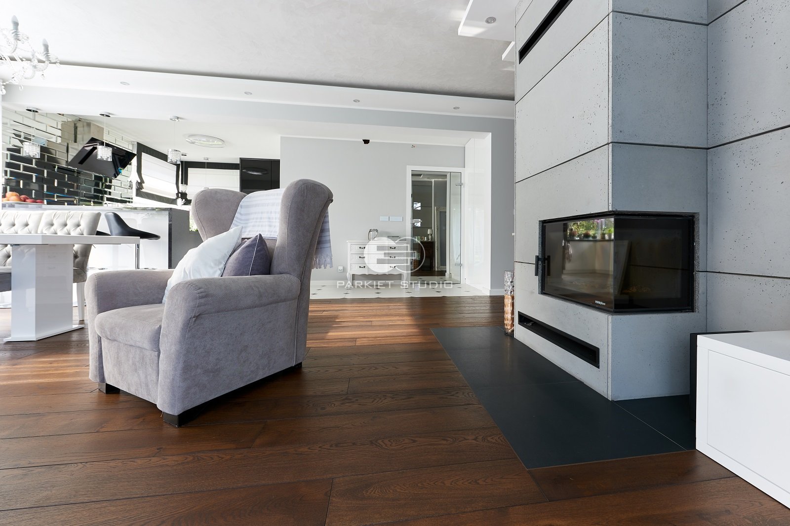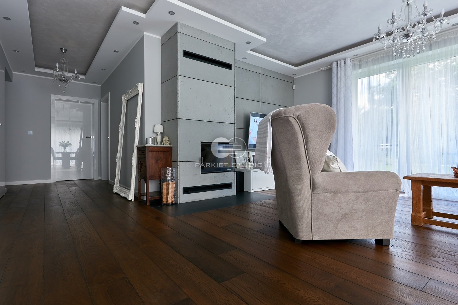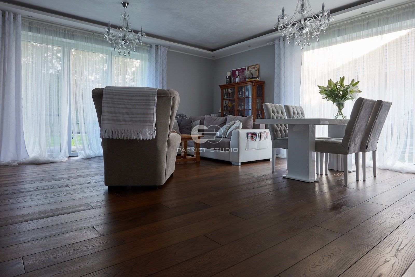 Deski dębowe wybarwione olejowoskami w tonacjach mocno ciemnego brązu. Podłoga będzie pasowała do dużych przeszklonych pomieszczeń urządzonych zarówno w stylu nowoczesnym jak i kolonialnym.