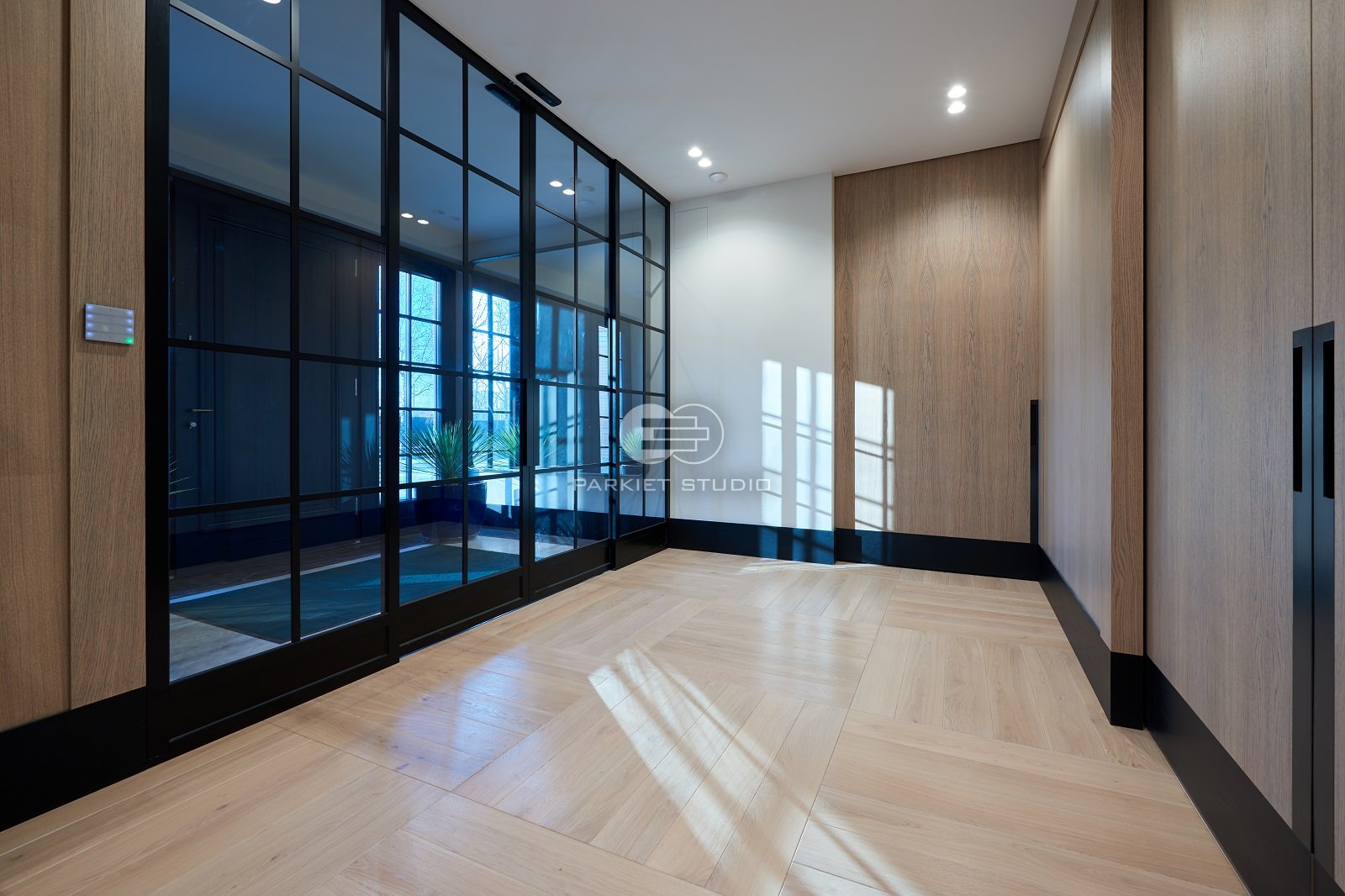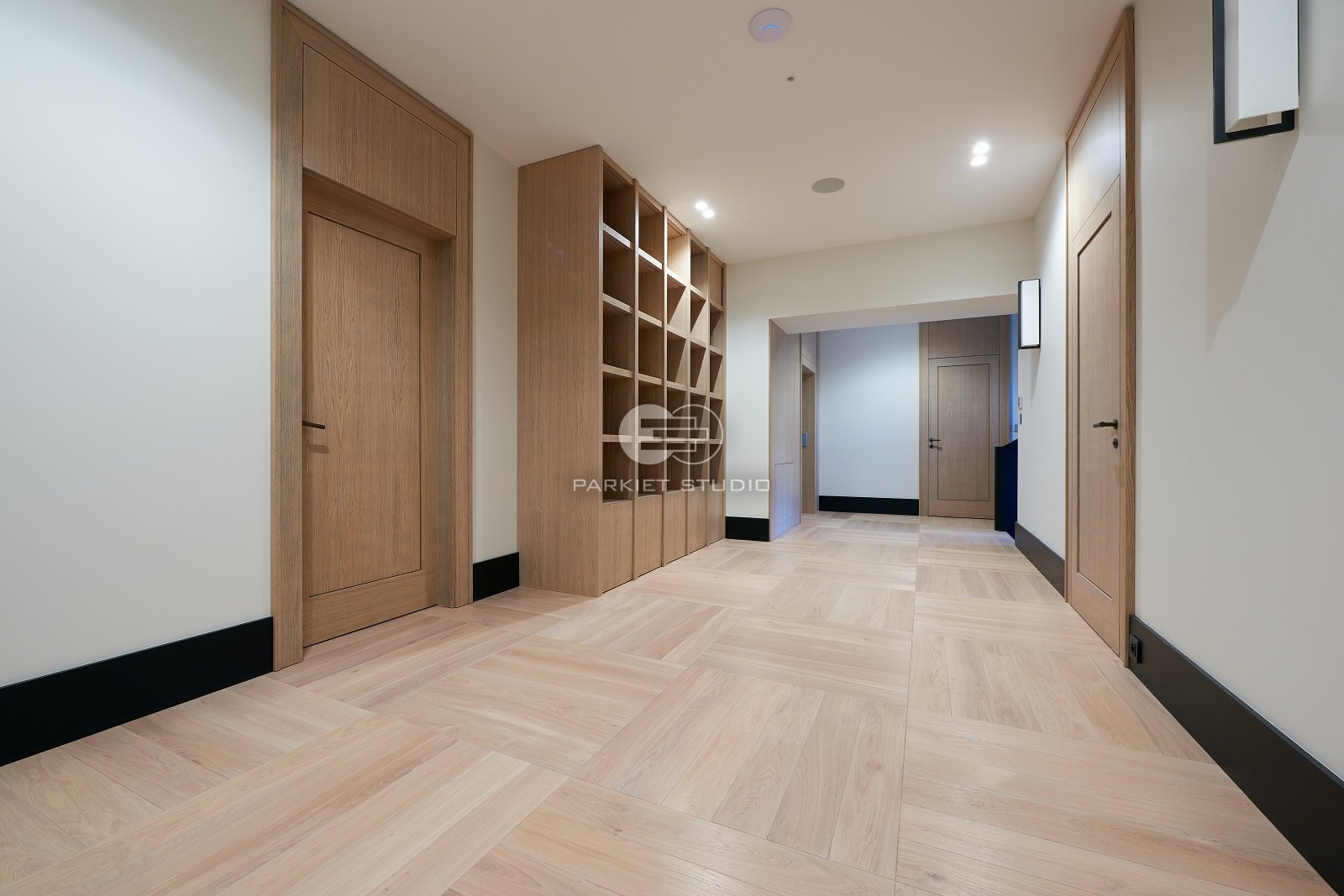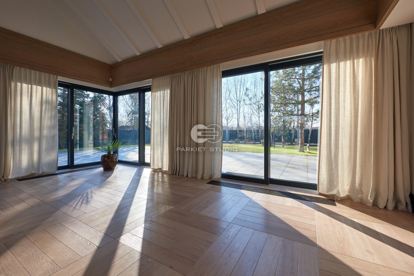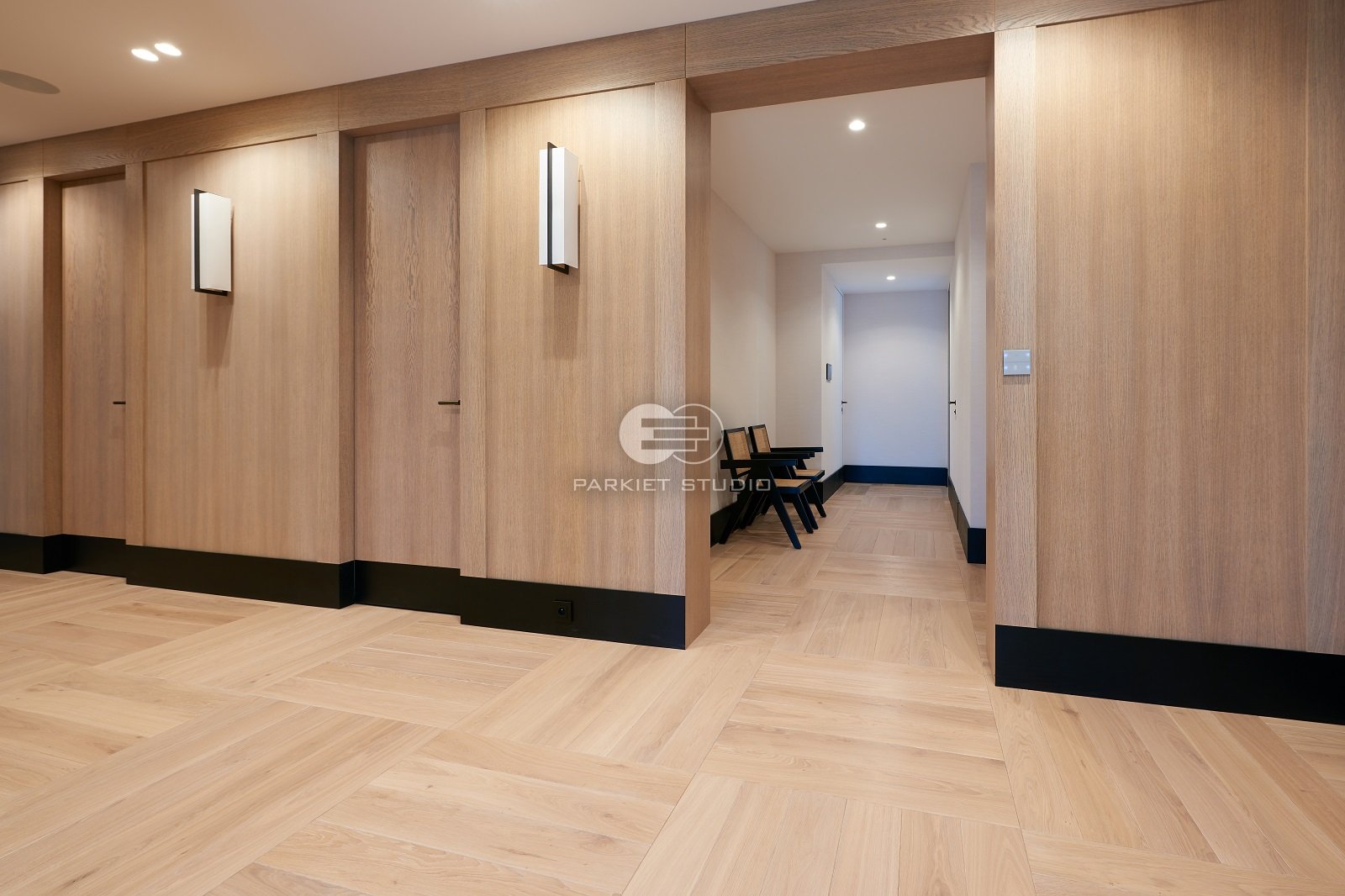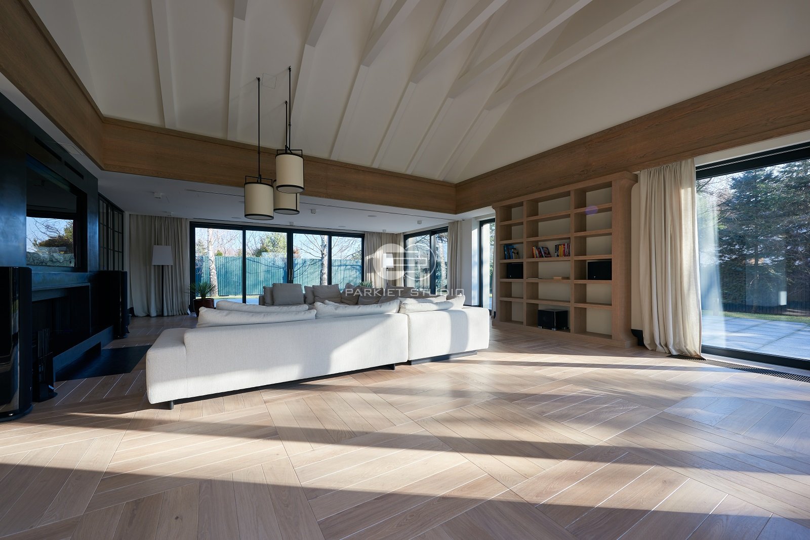 Ta dębowa podłoga została wykończona lakierem w delikatnym, zrównoważonym odcieniu bieli, który nadaje jej wyjątkowej lekkości i elegancji. Jasna kolorystyka optycznie rozświetla przestrzeń, dzięki czemu doskonale sprawdza się zarówno w mniejszych pomieszczeniach, jak i na dużych, otwartych powierzchniach.
