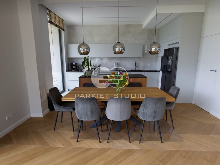 Dzięki zastosowaniu odpowiedniego olejowosku uzyskaliśmy na drewnie dębowym efekt kolorystyczny surowego drewna. Kolor lekki i elegancki. Delikatnie słomkowy, a nawet lekko szary.