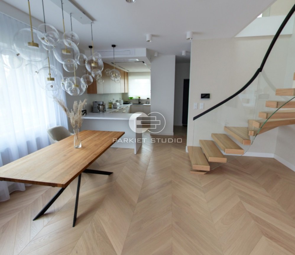 Podłoga szczotkowana, lakierowana w białym kolorze. Delikatny, biały kolor i widoczna struktura usłojenia nadaje tej podłodze wyjątkowej szlachetności.