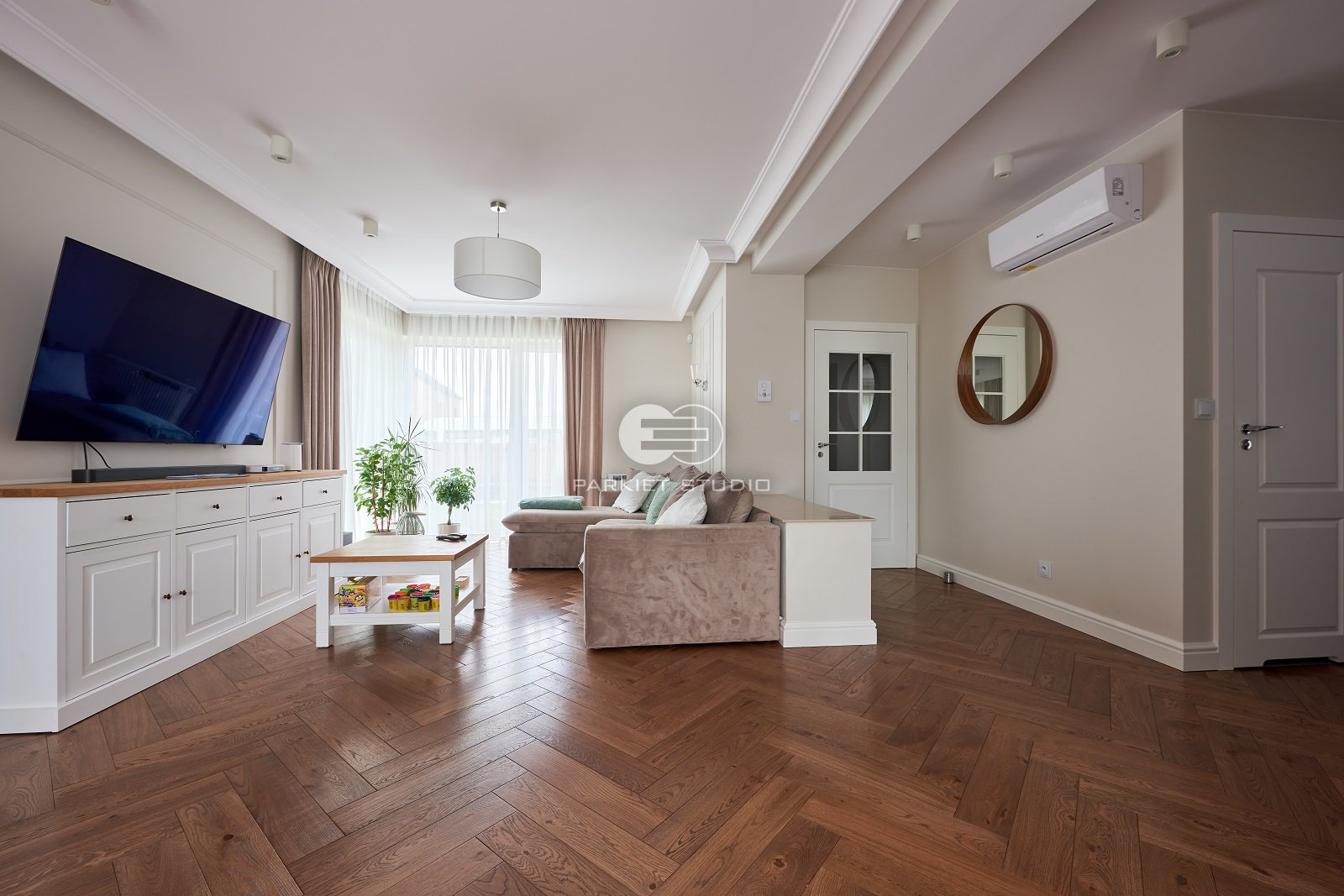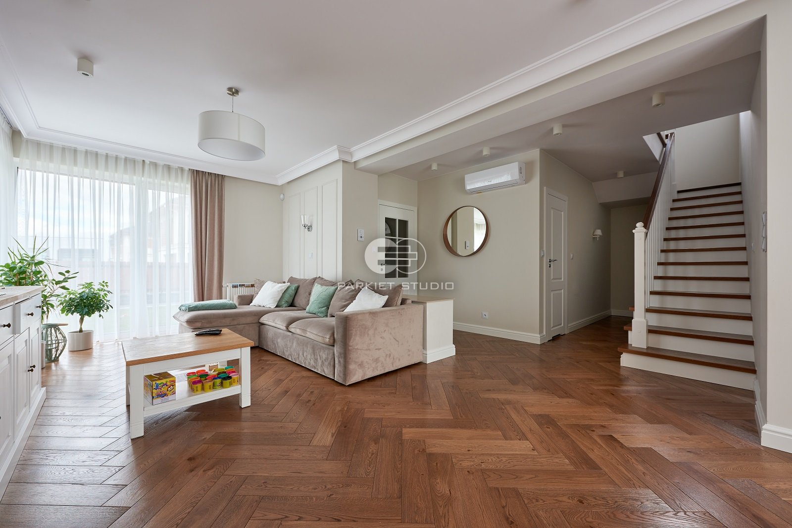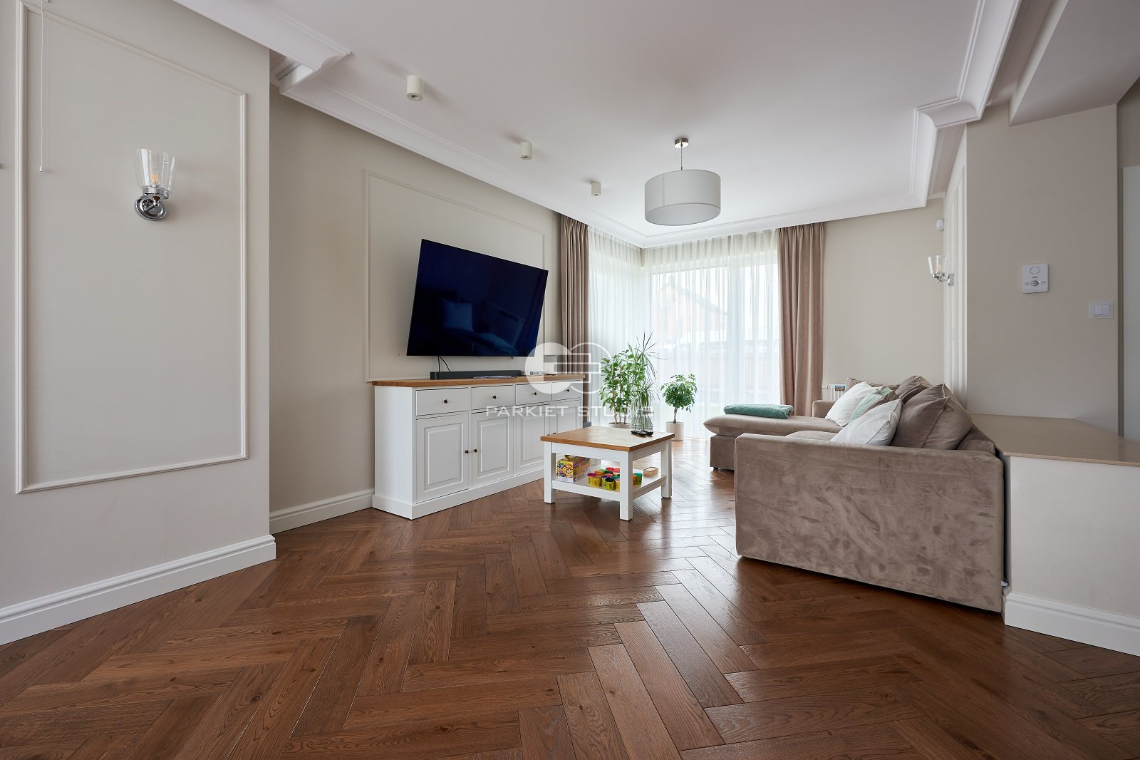 Podłoga została wykonana z wysokiej jakości drewna dębowego, charakteryzującego się trwałością i eleganckim rysunkiem słojów. Powierzchnia została starannie polakierowana, co nadaje jej subtelny połysk oraz zabezpiecza przed codziennym zużyciem. Kolorystyka utrzymana jest w chłodnej gamie brązu, z delikatnymi szarawymi tonami, które wprowadzają do wnętrza spokój, nowoczesną elegancję i doskonale komponują się zarówno z jasnymi, jak i ciemnymi elementami wystroju. Lakier uwydatnia naturalne piękno drewna, zachowując jego strukturę i głębię barw.
