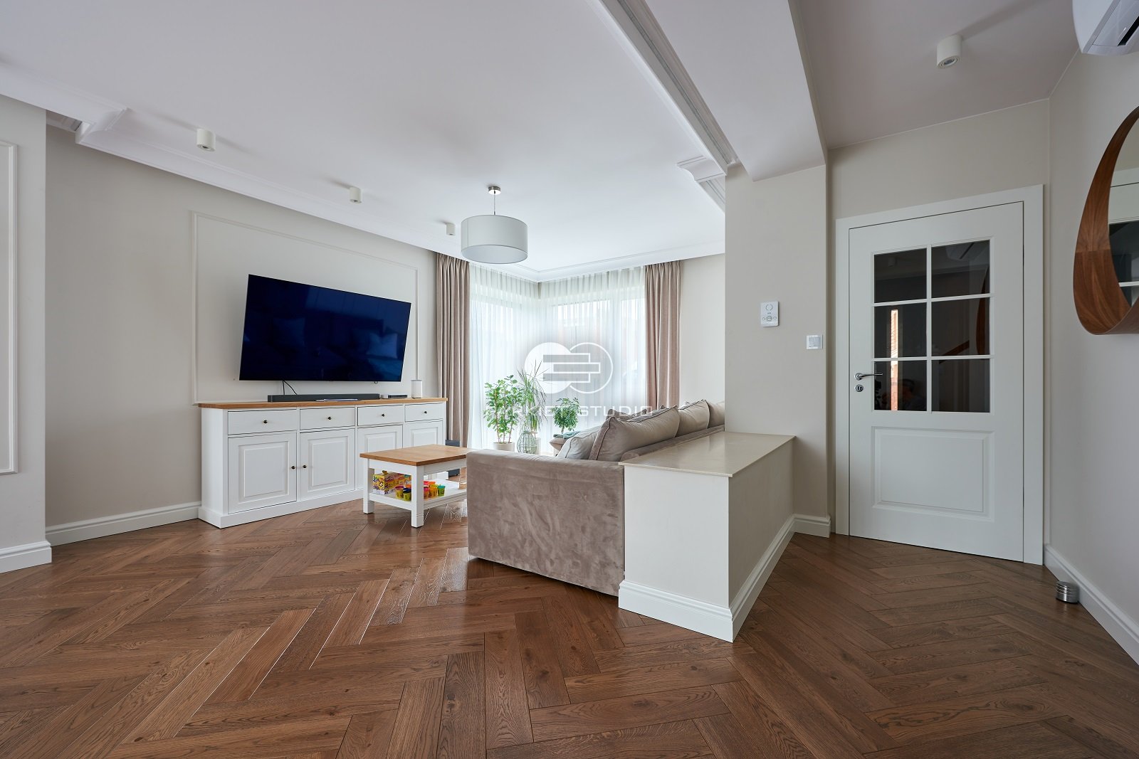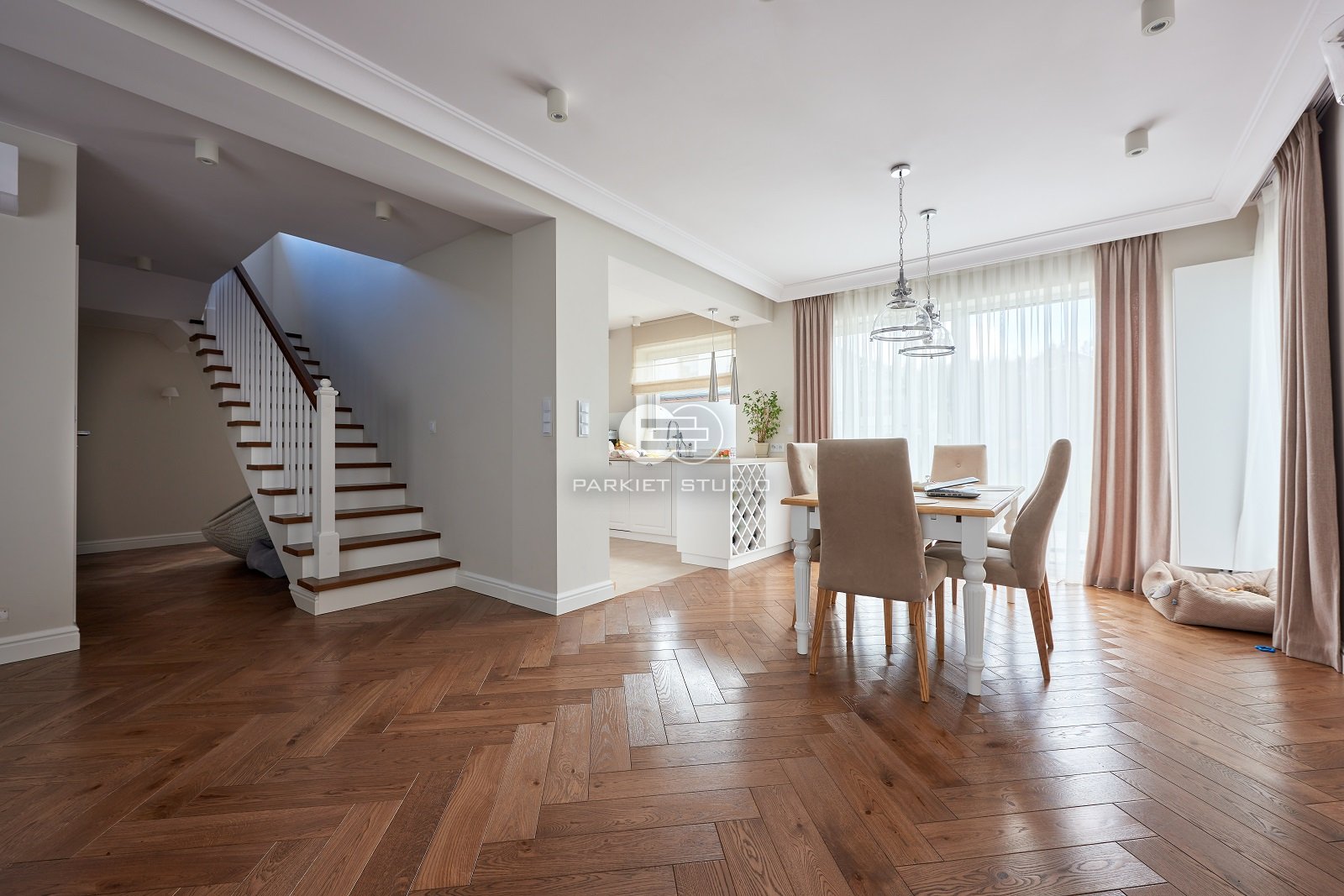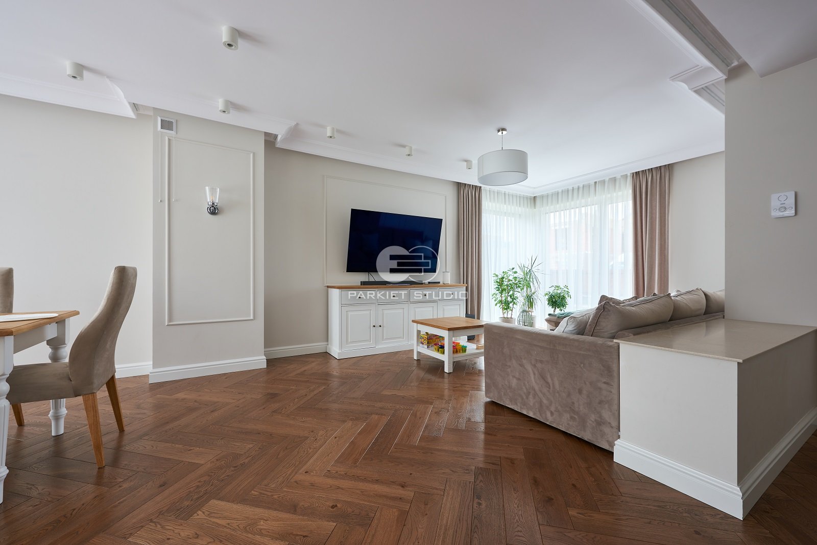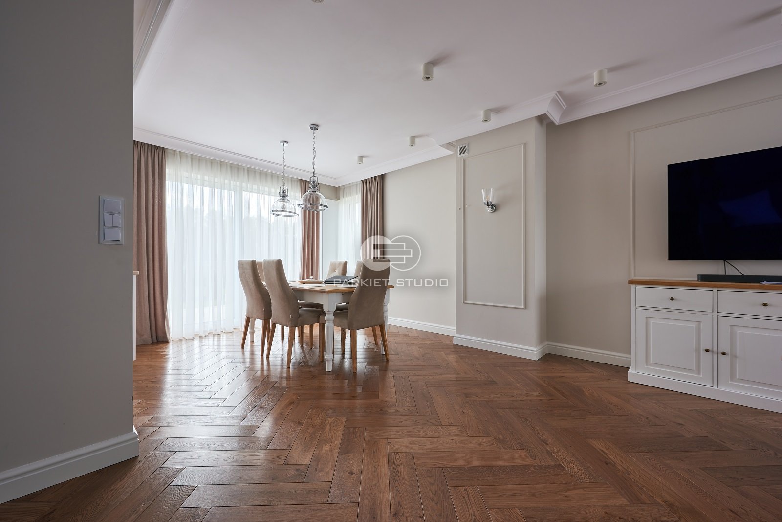 Podłoga została wykonana z wysokiej jakości drewna dębowego, charakteryzującego się trwałością i eleganckim rysunkiem słojów. Powierzchnia została starannie polakierowana, co nadaje jej subtelny połysk oraz zabezpiecza przed codziennym zużyciem. Kolorystyka utrzymana jest w chłodnej gamie brązu, z delikatnymi szarawymi tonami, które wprowadzają do wnętrza spokój, nowoczesną elegancję i doskonale komponują się zarówno z jasnymi, jak i ciemnymi elementami wystroju. Lakier uwydatnia naturalne piękno drewna, zachowując jego strukturę i głębię barw.