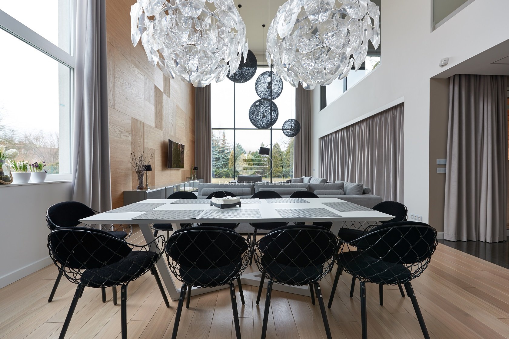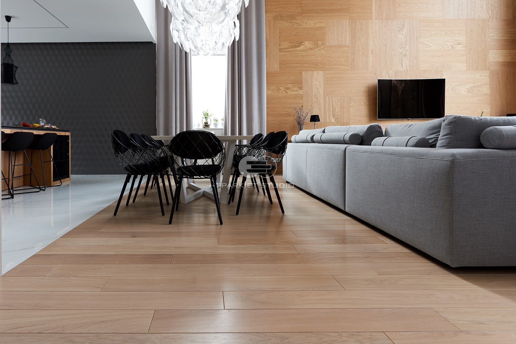 Ta dębowa podłoga została wykończona lakierem w delikatnym, zrównoważonym odcieniu bieli, który nadaje jej wyjątkowej lekkości i elegancji. Jasna kolorystyka optycznie rozświetla przestrzeń, dzięki czemu doskonale sprawdza się zarówno w mniejszych pomieszczeniach, jak i na dużych, otwartych powierzchniach.