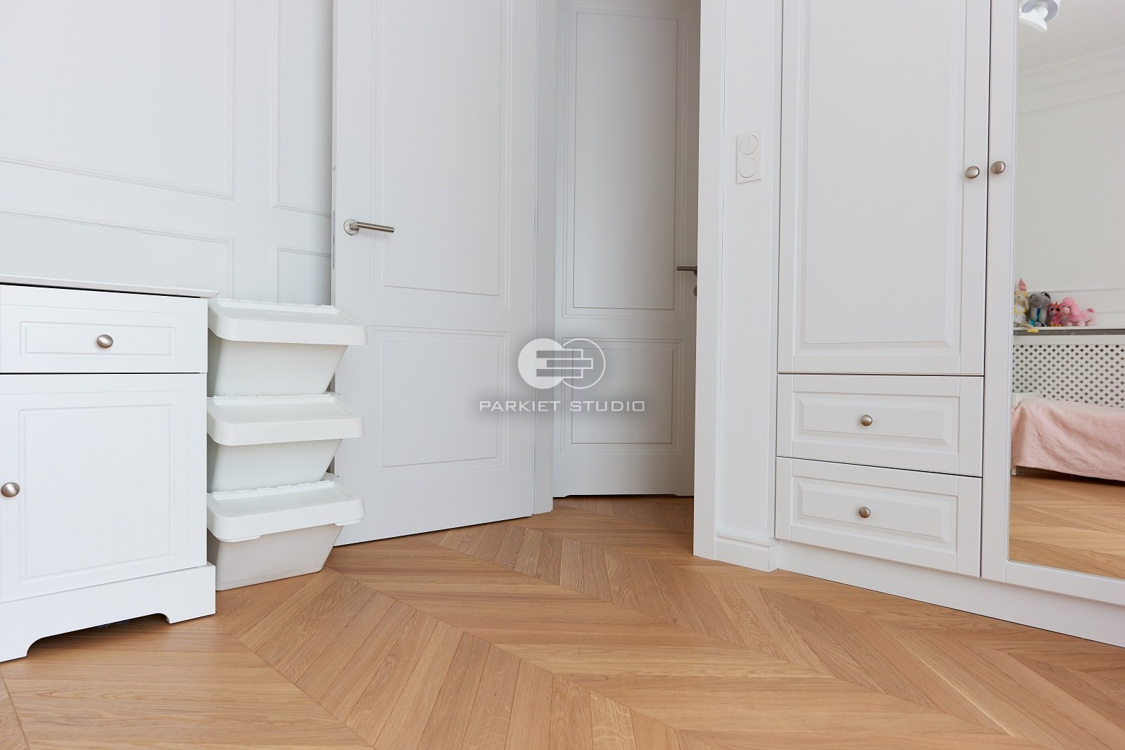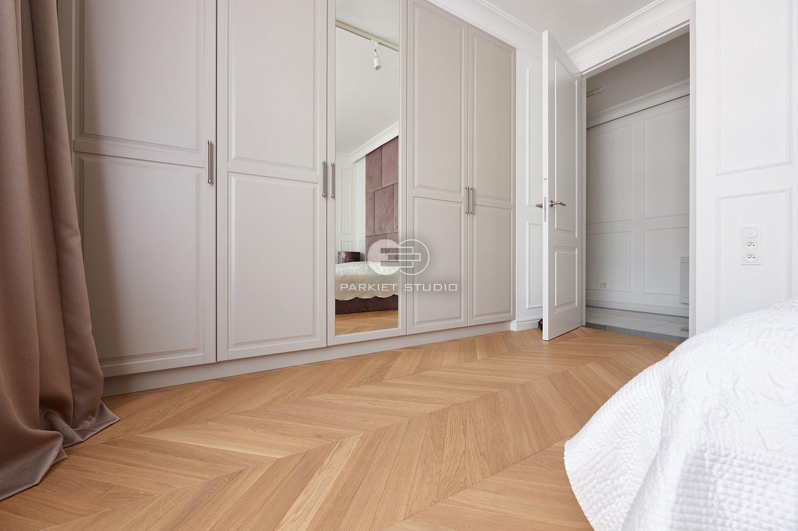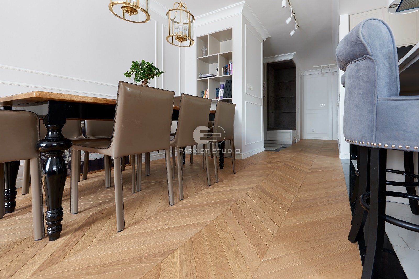 Jodełka Francuska Finish to podłoga dwuwarstwowa, olejowoskowana, fazowana czterostronnie - po przyklejeniu nie wymaga cyklinowania.