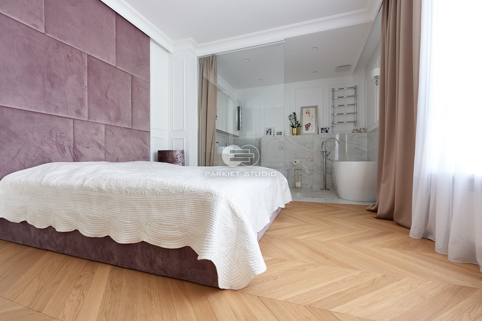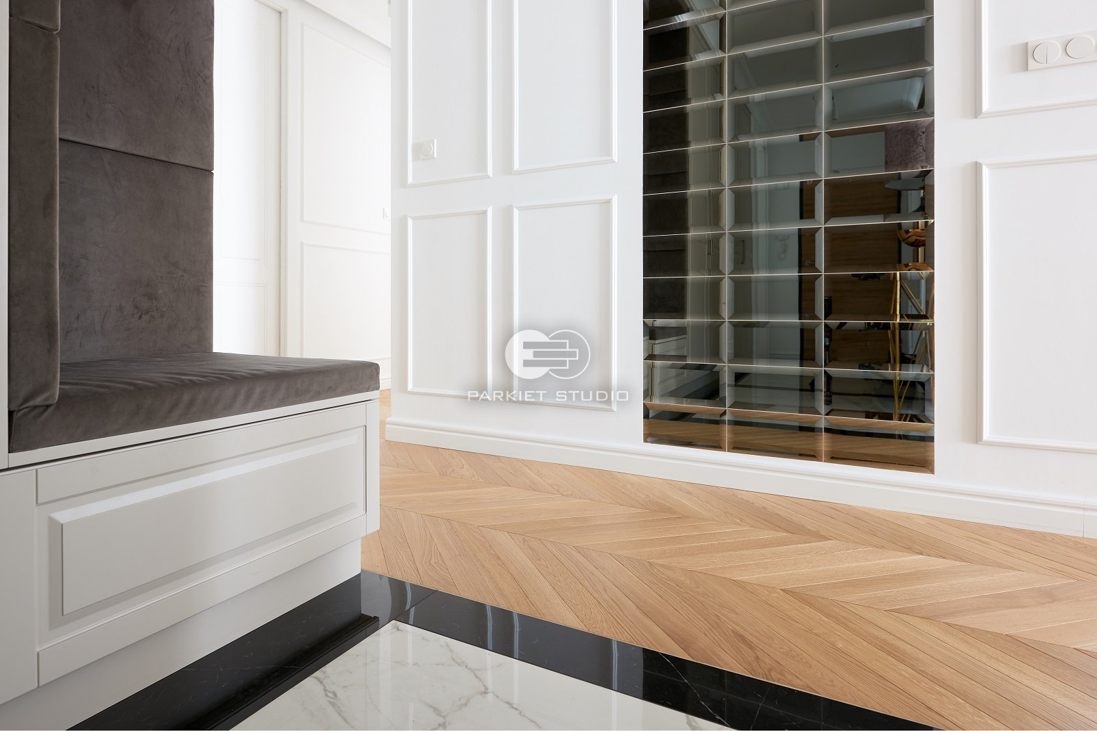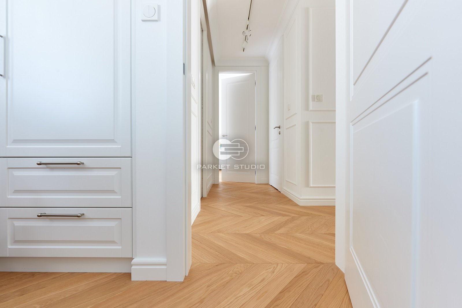 Jodełka Francuska Finish to podłoga dwuwarstwowa, olejowoskowana, fazowana czterostronnie - po przyklejeniu nie wymaga cyklinowania.