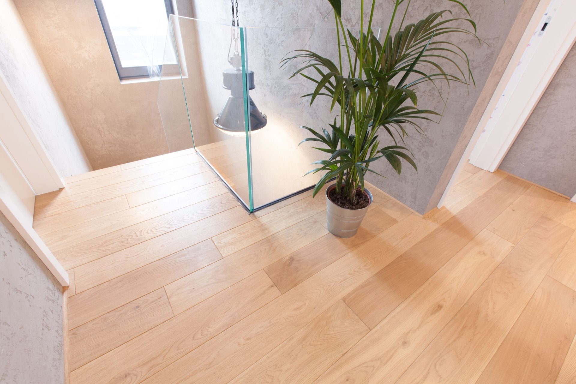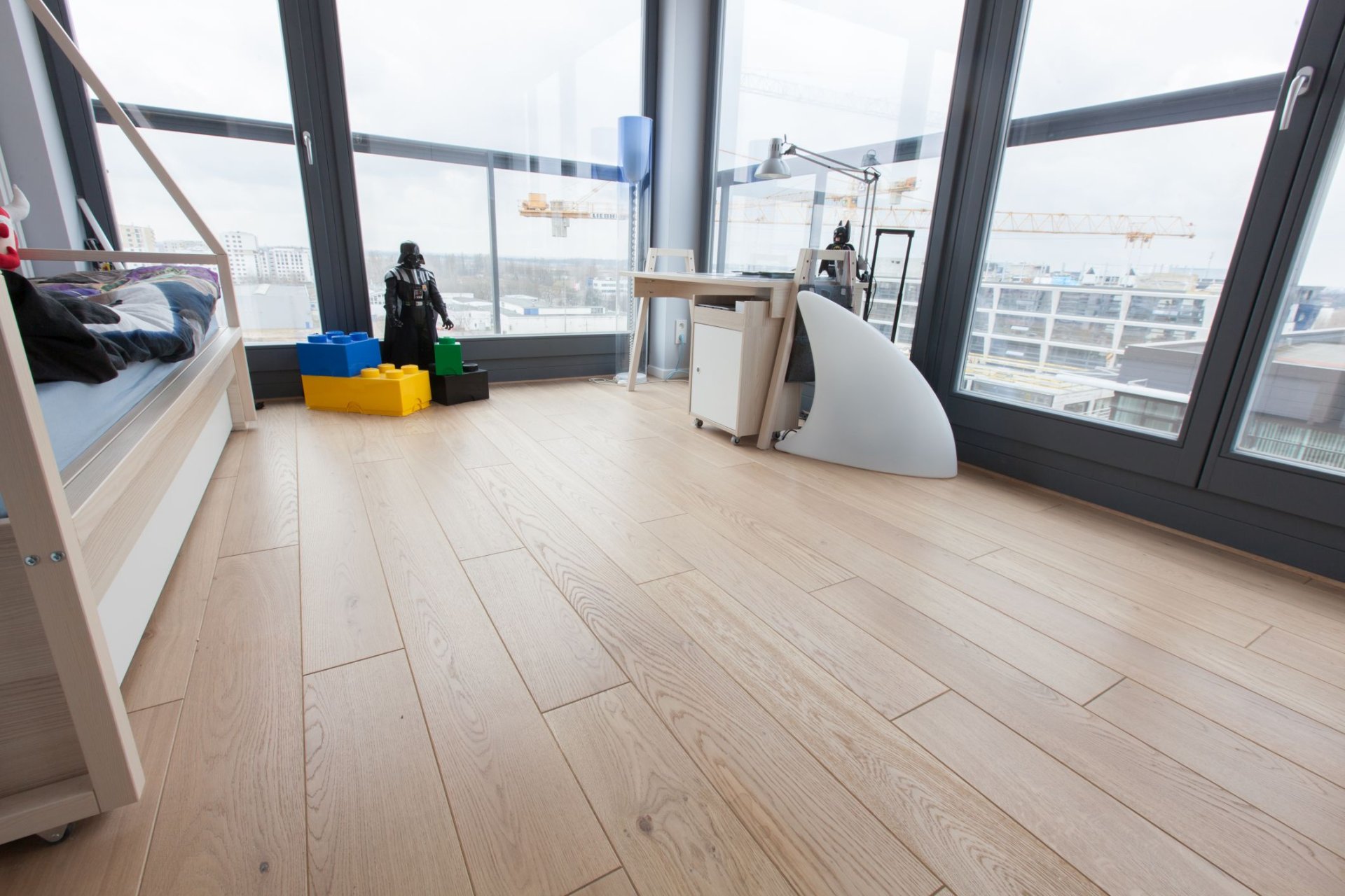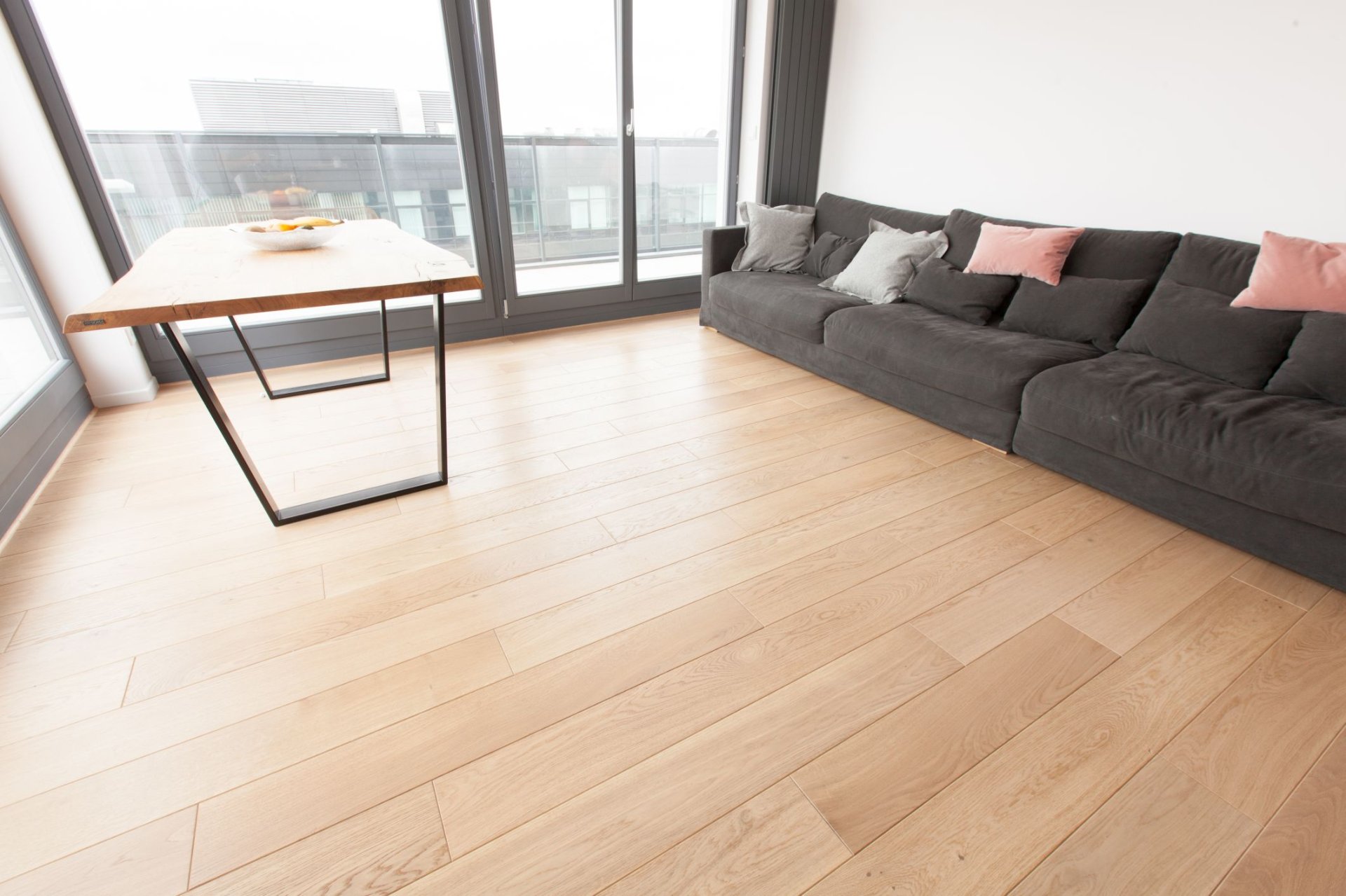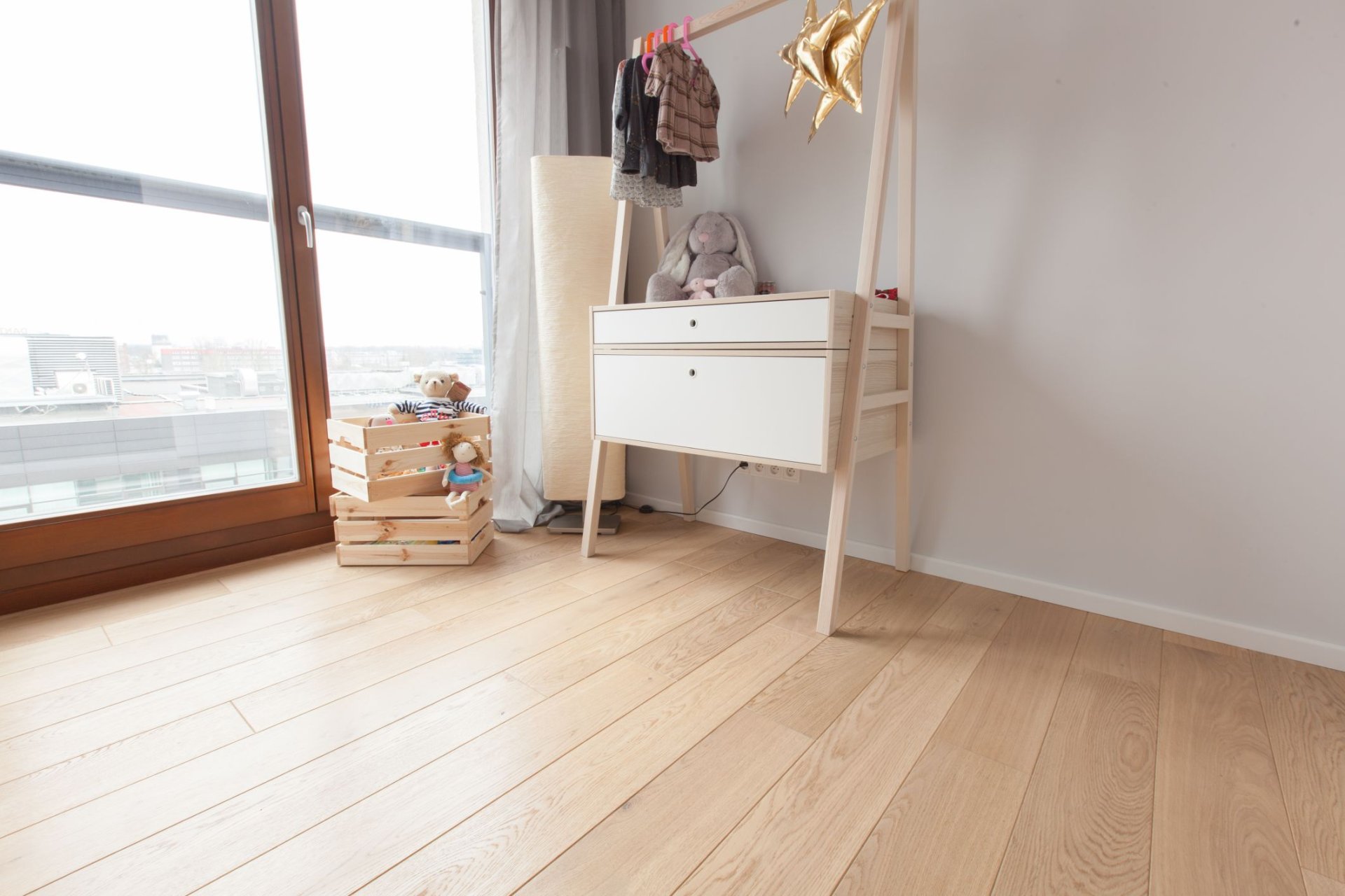 Podłoga wykonana z naturalnego drewna dębowego, charakteryzuje się wyjątkową trwałością i szlachetnym wyglądem. Została wykończona matowym lakierem, który nadaje jej subtelny, naturalny efekt, bez nadmiernego połysku. Jasna tonacja drewna wprowadza do wnętrza poczucie przestronności, lekkości i świeżości, doskonale rozświetlając pomieszczenie. Matowe wykończenie podkreśla autentyczną strukturę słojów i fakturę drewna, zachowując jego ciepły, organiczny charakter. To elegancka i ponadczasowa baza, która pasuje zarówno do nowoczesnych jak i klasycznych aranżacji.
