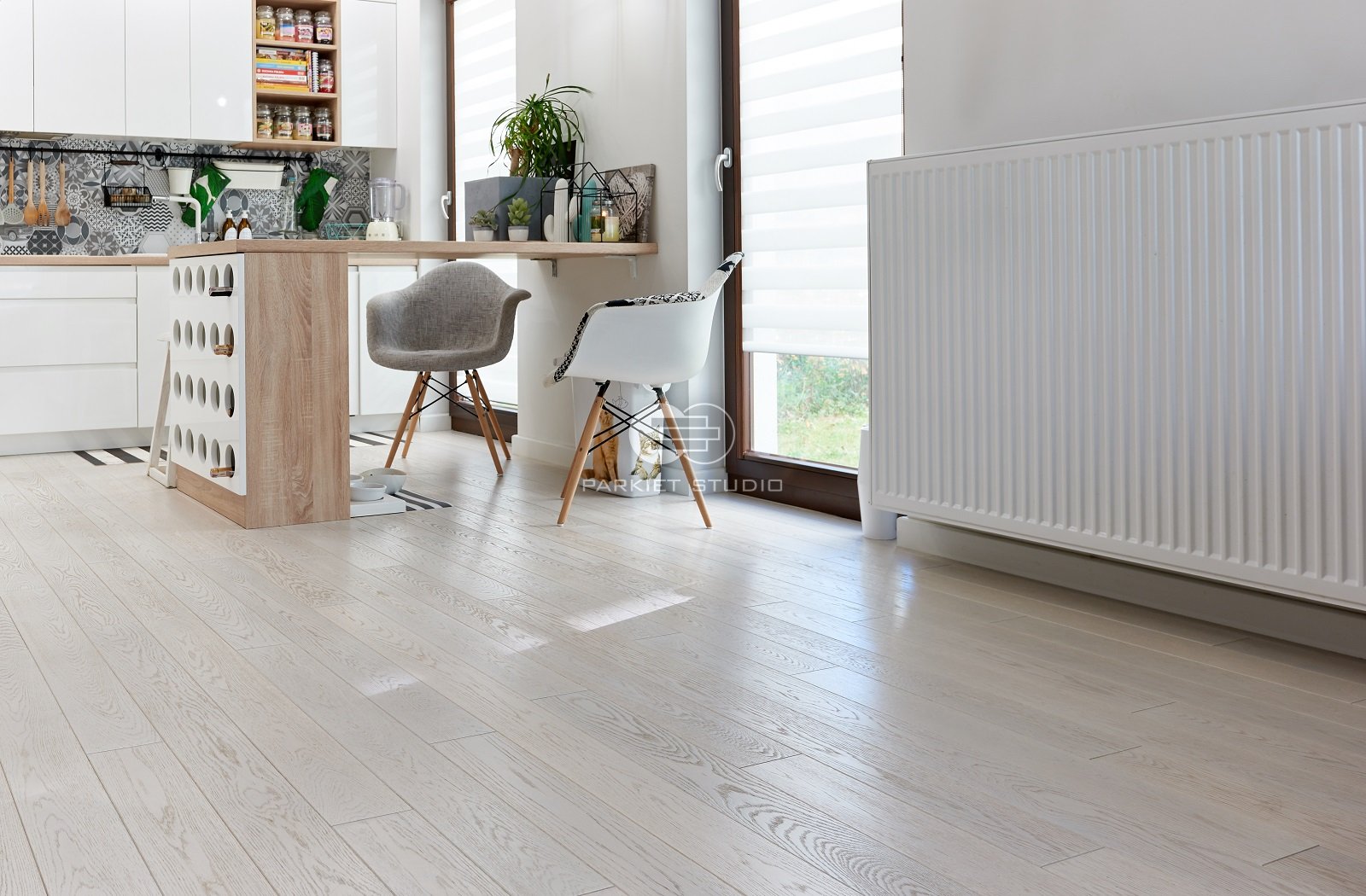 Dębowa deska podłogowa o unikalnej, prawie śnieżnobiałej barwie to propozycja dla wszystkich ceniących skandynawski szyk i prostotę. Jednocześnie delikatna i zdecydowana, dzięki swojej kolorystyce, odświeża wnętrza oraz optycznie je powiększa, co sprawdza się zwłaszcza w małych pomieszczeniach. Subtelnie przebijająca struktura dębowego drewna wpadająca w szarości nadaje podłodze nowoczesności i nietuzinkowości.